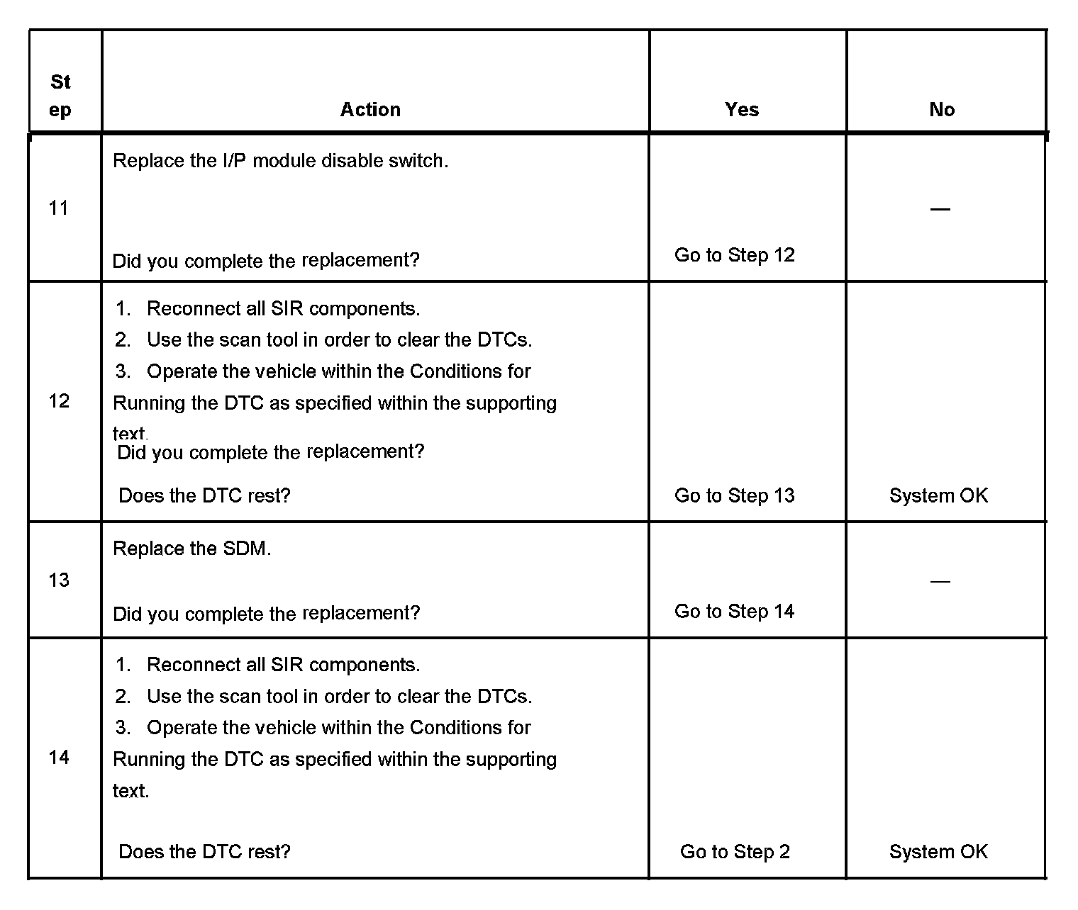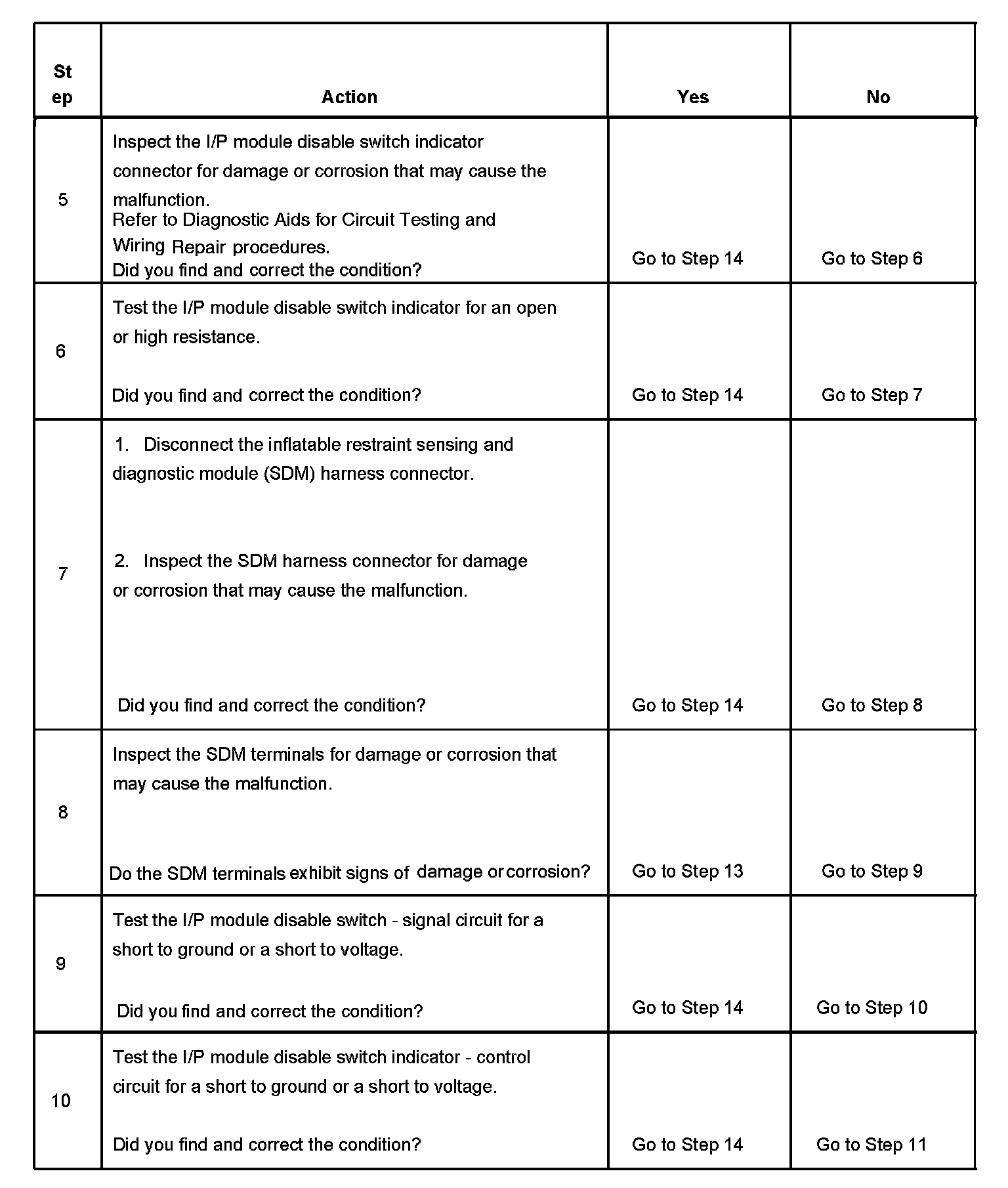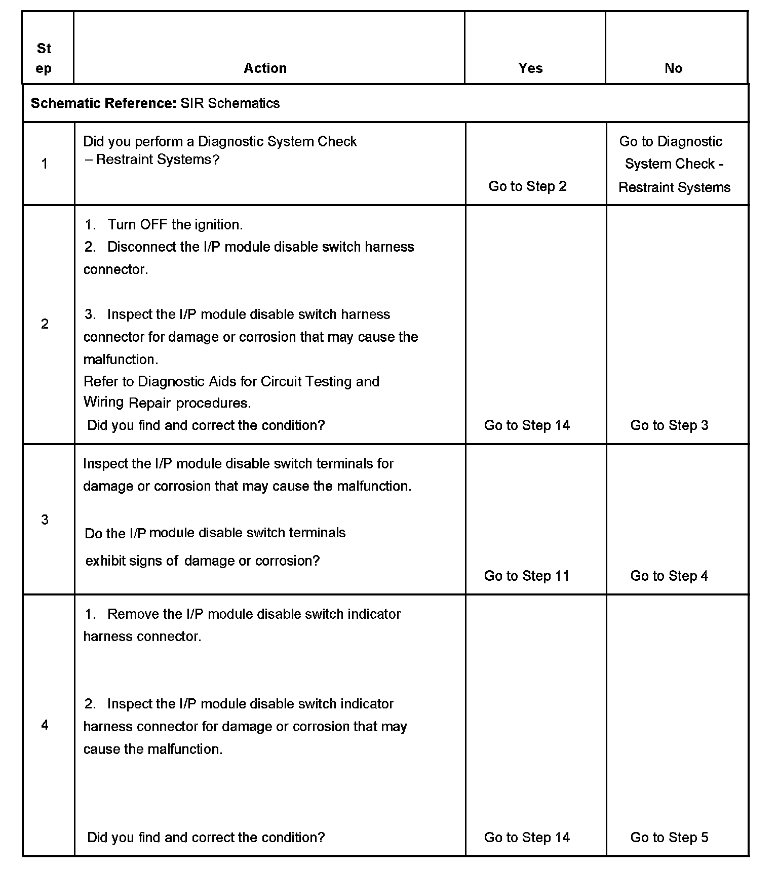 CIRCUIT DESCRIPTIONWhen the ignition is turned ON, the inflatable restraint sensing and diagnostic module (SDM) performs tests to diagnose critical malfunctions within the SIR system. The SDM monitors the I/P module disable switch-signal and I/P module disable switch indicator-control circuits in order to determine whether or not to disable the inflatable restraint I/P module. The SDM also monitors the I/P module disable switch-signal and the I/P module disable switch indicator-control circuits for an open, high resistance, short to ground or short to voltage condition.