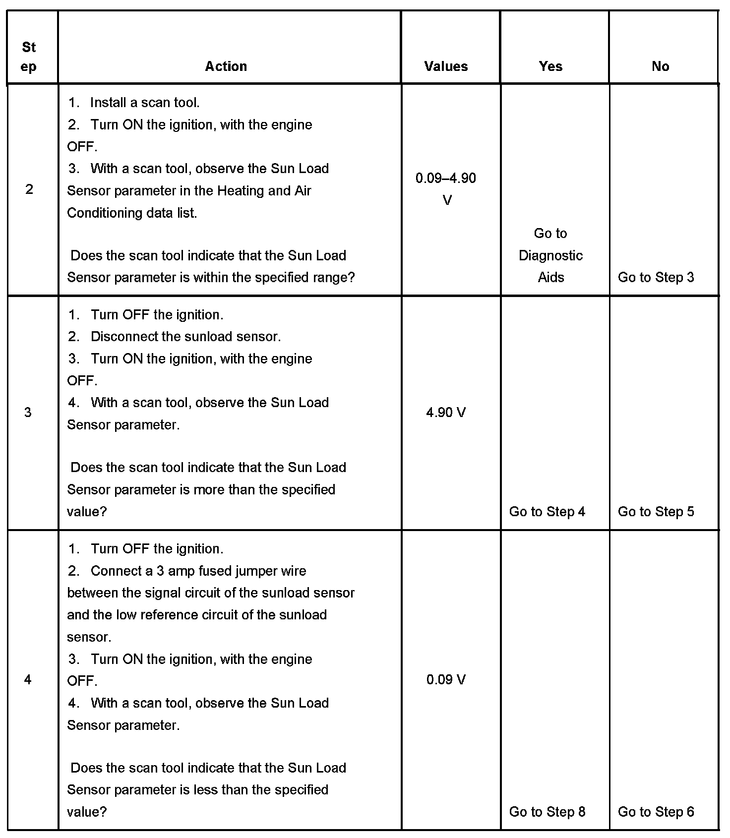 The HVAC control module monitors the ambient light on the inside of the vehicle through a light sensitive photodiode which is called a sunload sensor. The HVAC control module uses this information to compensate for the effect of the sun on the inside air temperature of the vehicle. When the sensor is in direct sunlight, the signal voltage is low. When the sensor is shaded, the signal voltage is high. The HVAC control module requests A/C compressor clutch engagement and controls the air temperature actuator door positions in order to maintain the selected air temperature.