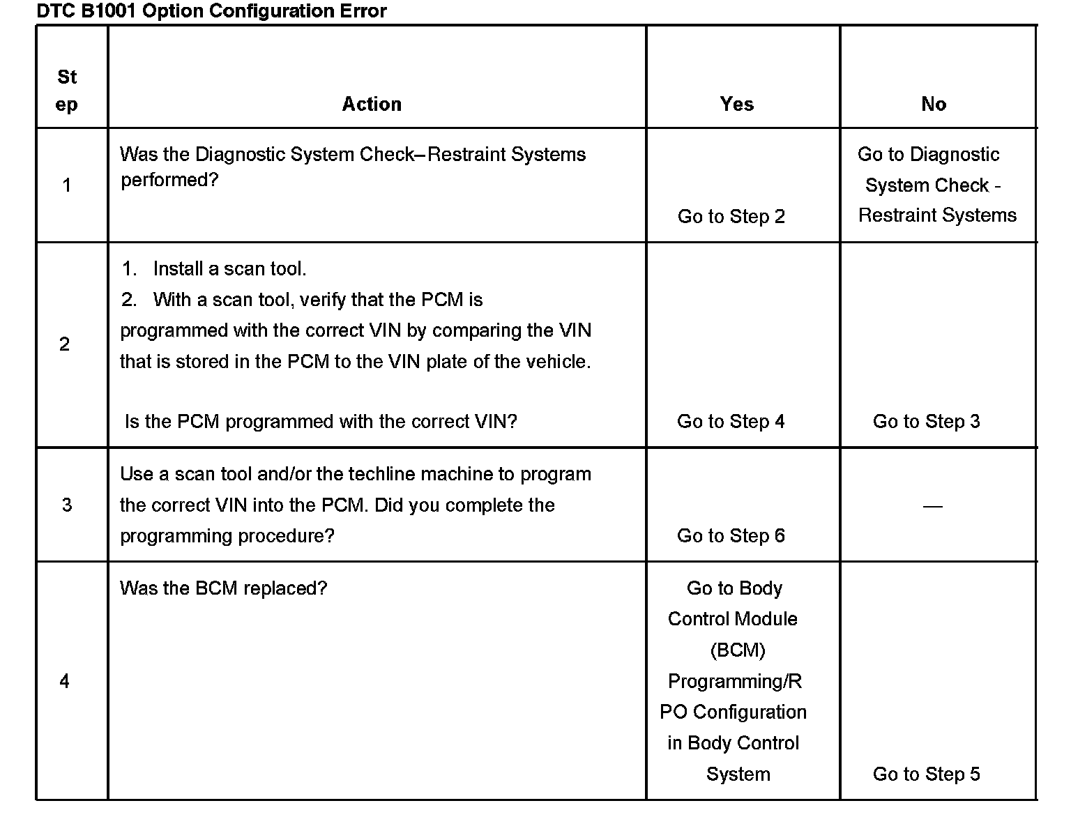 DTC B1001 is an indication that the restraints ID's stored in both the BCM and SDM and/or the VIN information stored in the PCM and the SDM do not match. If either the BCM and/or powertrain control module (PCM) were replaced, the replacement modules need to be reprogrammed for proper operation.