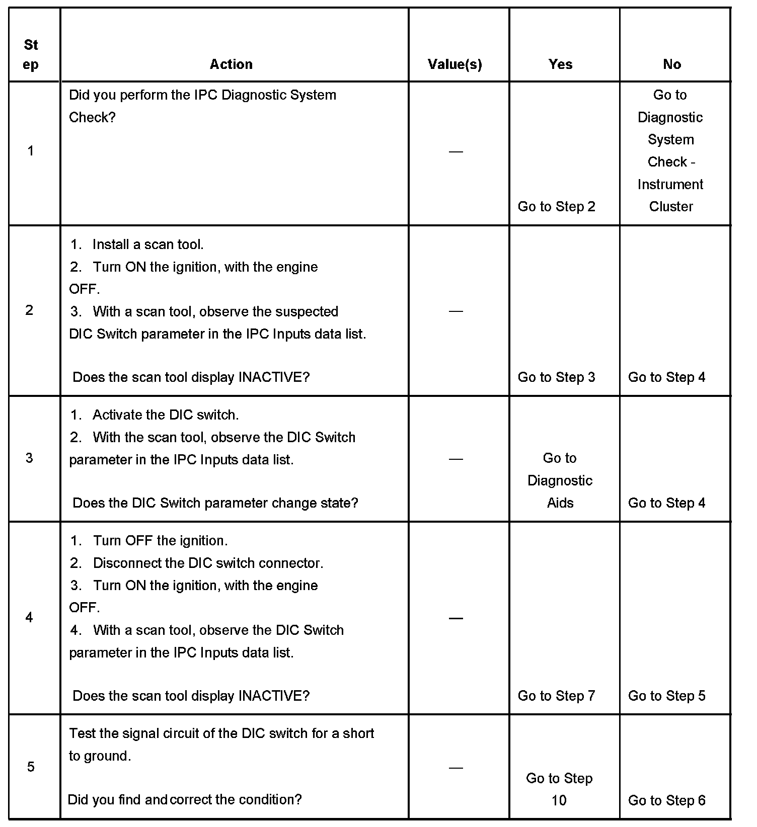 2. Tests for the normal state of the DIC switch using a scan tool. The scan tool will display the normal state as INACTIVE, and ACTIVE when the switch is activated.