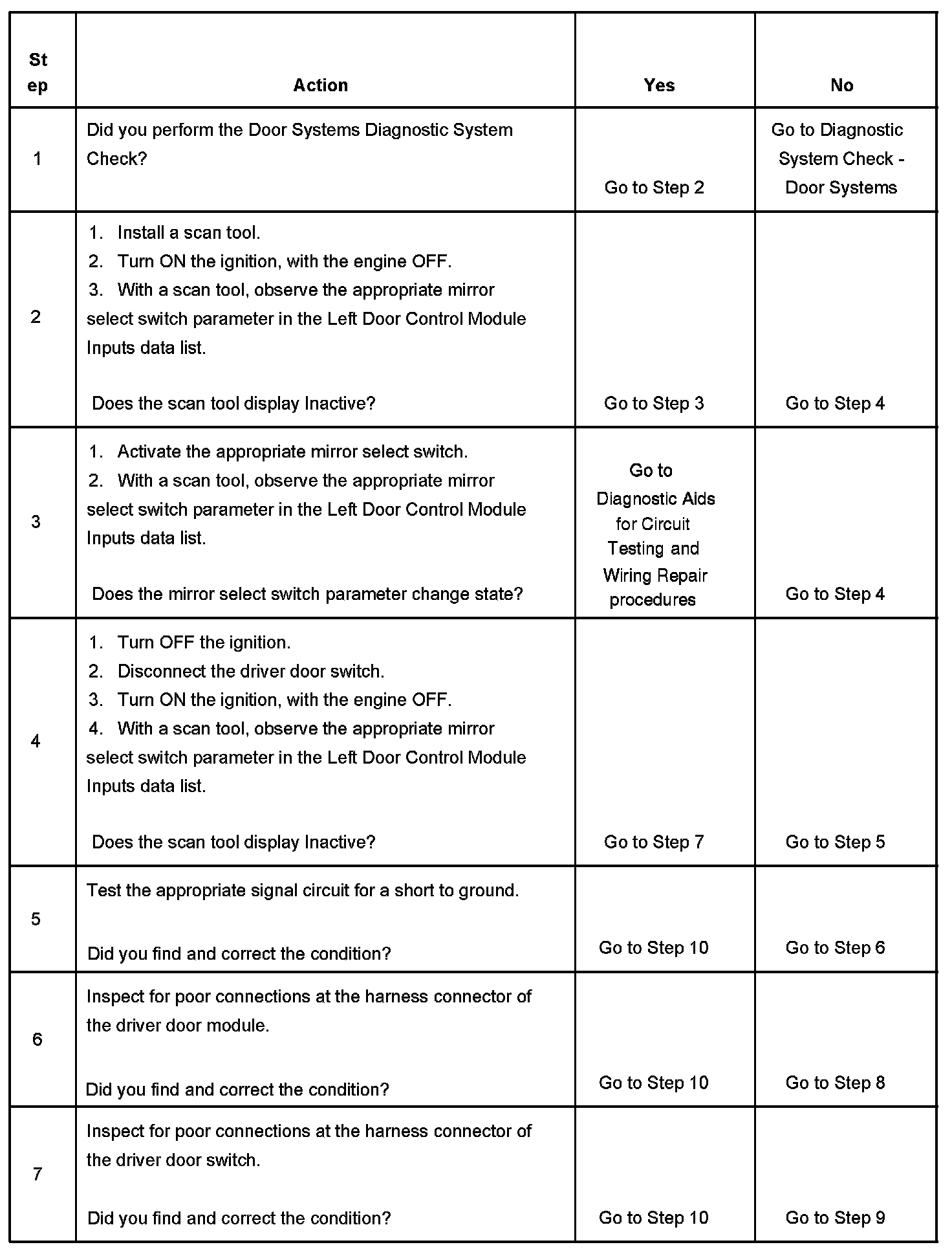 5. Tests for a short to ground in the mirror select switch signal circuit.
