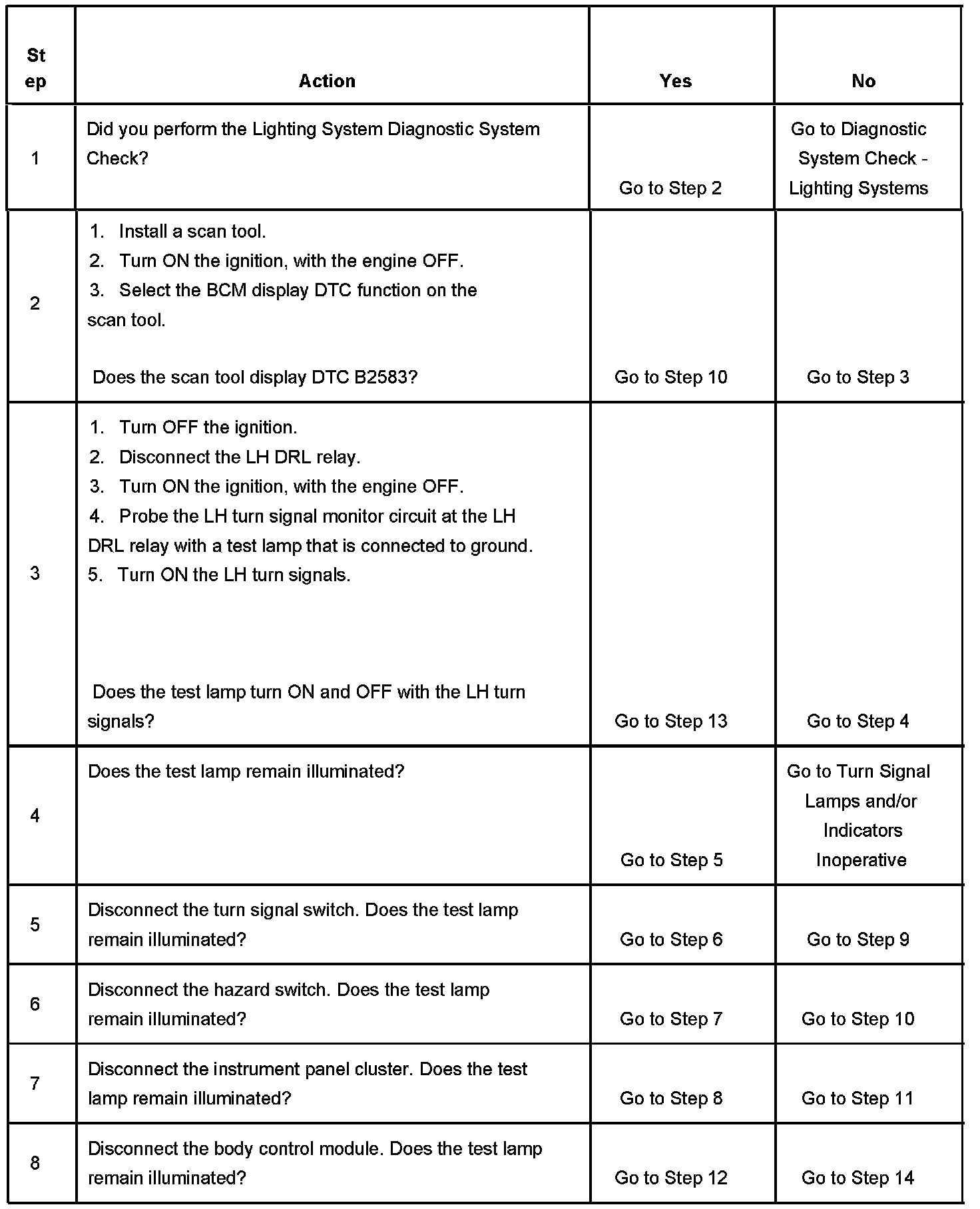 3. Tests if the BCM is receiving oscillating voltage on the LH turn signal monitor circuit. If the test lamp is ON steady, the BCM will set a DTC B2583.
