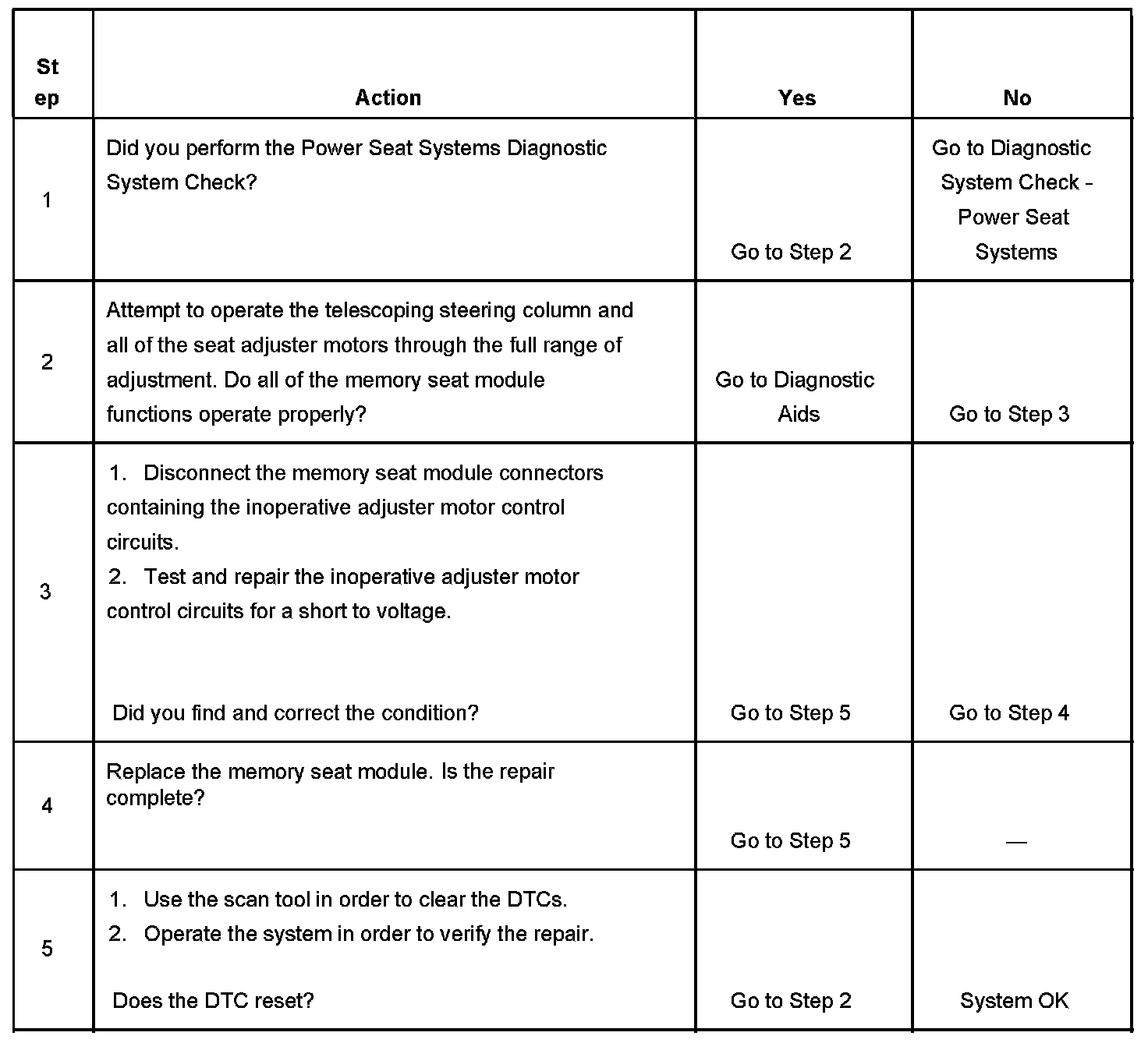 3. This step determines if a control circuit is shorted to voltage or the fault is in the memory seat module.
