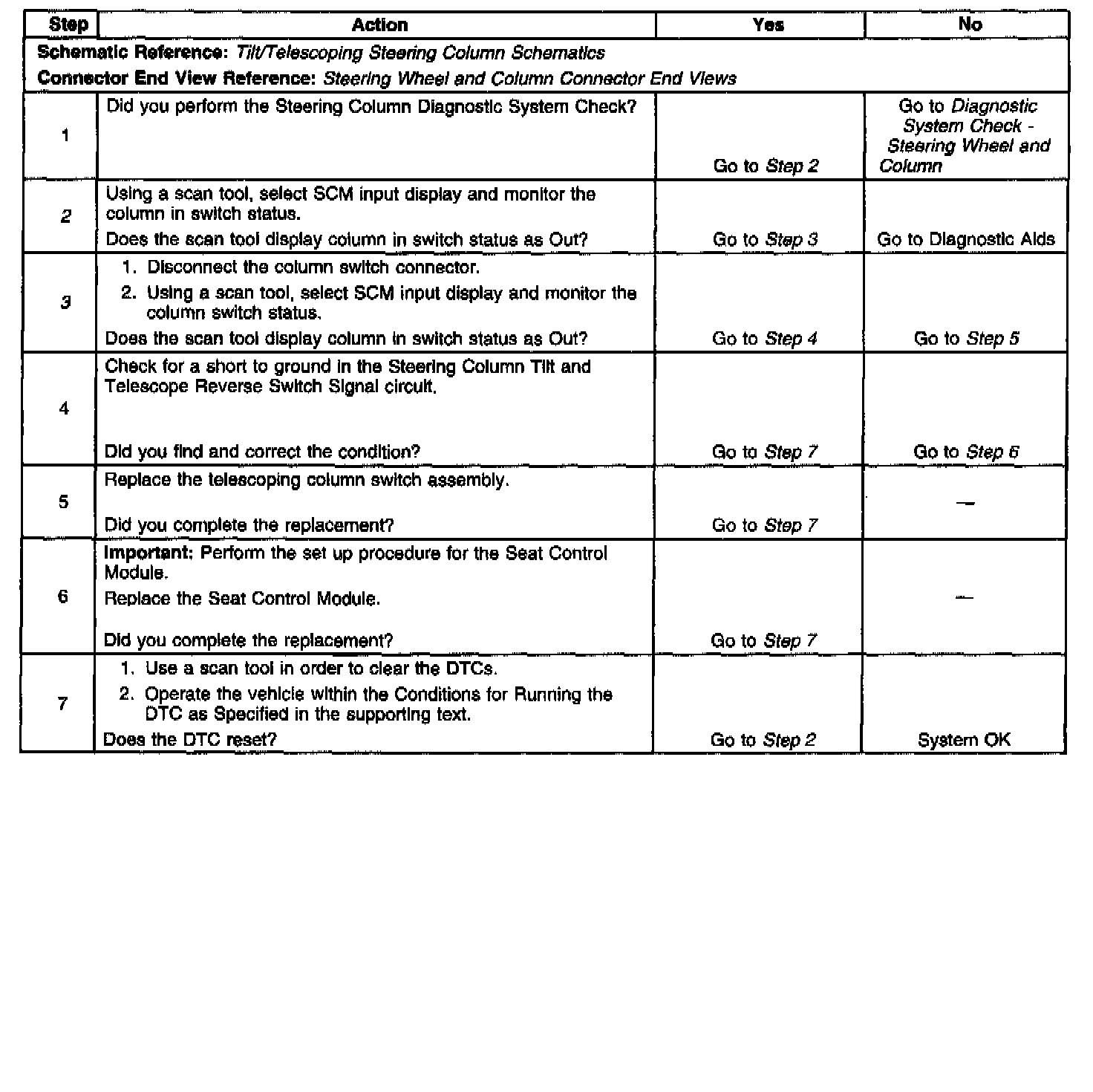 ^ Using a scan tool, select scan tool inputs and monitor steering column switch status. If the scan tool displays Out, disconnect the steering column switch. If the display changes to Idle, replace the switch. If the scan tool still displays Out, check steering column telescope reverse switch signal circuit for a short to ground.