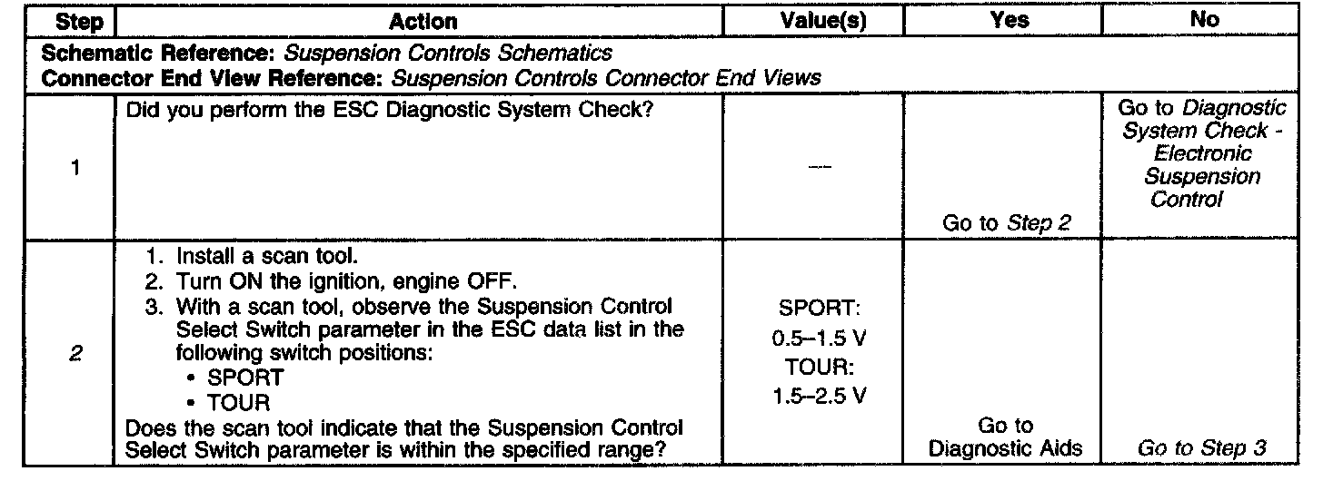 2. This tests the suspension control switch voltage range in various switch positions using a scan tool. Normal switch voltage range is between 0.5-2.5 volts.