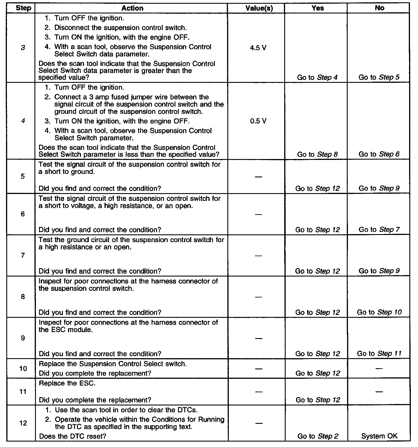 ^ A DTC B3577 may set if the suspension control switch terminals are making poor contact to the switch, or if there is a small amount of corrosion on the terminals. Check for these conditions first before attempting to use the diagnostic table, as this may correct the condition.