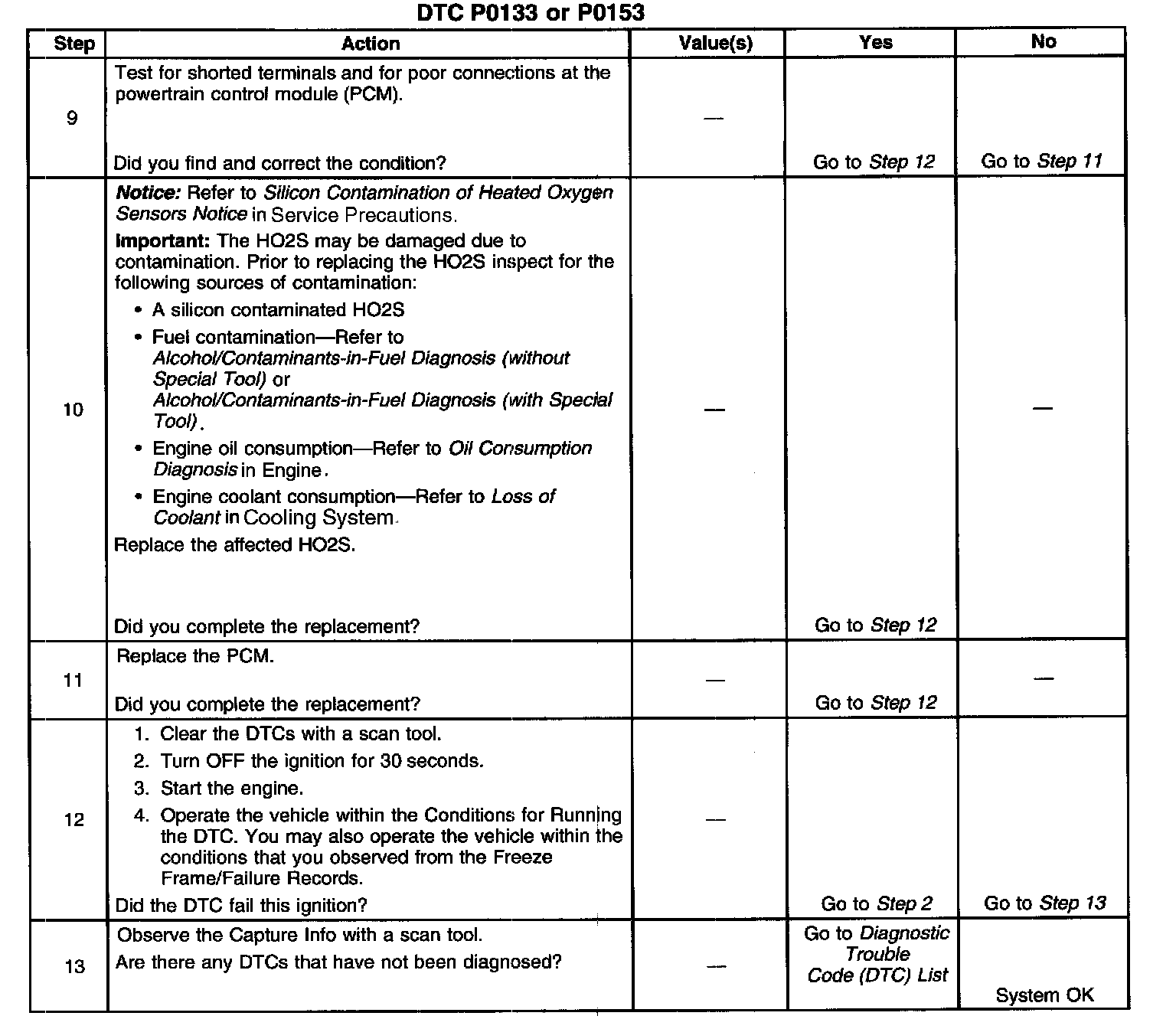Heated oxygen sensors (HO2S) are used for fuel control and post catalyst monitoring. Each HO2S compares the oxygen content of the surrounding air with the oxygen content in the exhaust stream. The HO2S must reach operating temperature to provide an accurate voltage signal. Heating elements inside the HO2S minimize the time required for the sensors to reach operating temperature. The powertrain control module (PCM) supplies the HO2S with a reference, or bias, voltage of about 450 mV. When the engine is first started the PCM operates in open loop, ignoring the HO2S voltage signal. Once the HO2S reaches operating temperature and closed loop is achieved, the HO2S generates a voltage within a range of 0-1,000 mV that fluctuates above and below bias voltage. High HO2S voltage indicates a rich exhaust stream; low HO2S voltage indicates a lean exhaust stream. This diagnostic will only run once per ignition cycle. The PCM monitors the rich-to-lean and lean-to-rich transition time. A transition is defined as, the HO2S voltage changes from above 625 mV to below 250 mV or from below 250 mV to above 625 mV. If the PCM detects that the transition time is too long, DTC P0133 or P0153 sets.