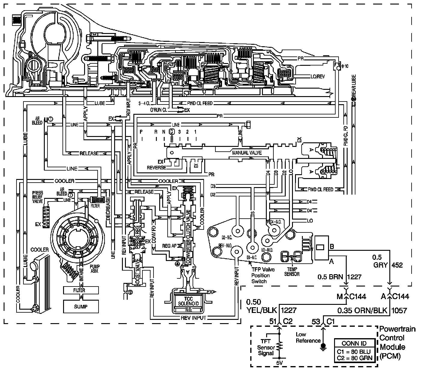 The flow of transmission fluid starts in the bottom pan and is drawn through the filter, control valve body assembly, transmission case and into the oil pump assembly. The oil pump assembly pressurizes the fluid and directs it to the pressure regulator valve where it becomes the main supply of fluid to the various components and hydraulic circuits in the transmission. Hot fluid exiting the torque converter flows through the converter clutch apply valve and into the transmission cooler lines to the oil cooler located in the vehicle radiator, and auxiliary cooler if equipped. From the cooler, fluid returns to cool and lubricate the front of the transmission. In forward drive ranges, D4 fluid from the manual valve is routed through an orificed cup plug in the rear of the transmission case to feed the rear lube fluid circuit.