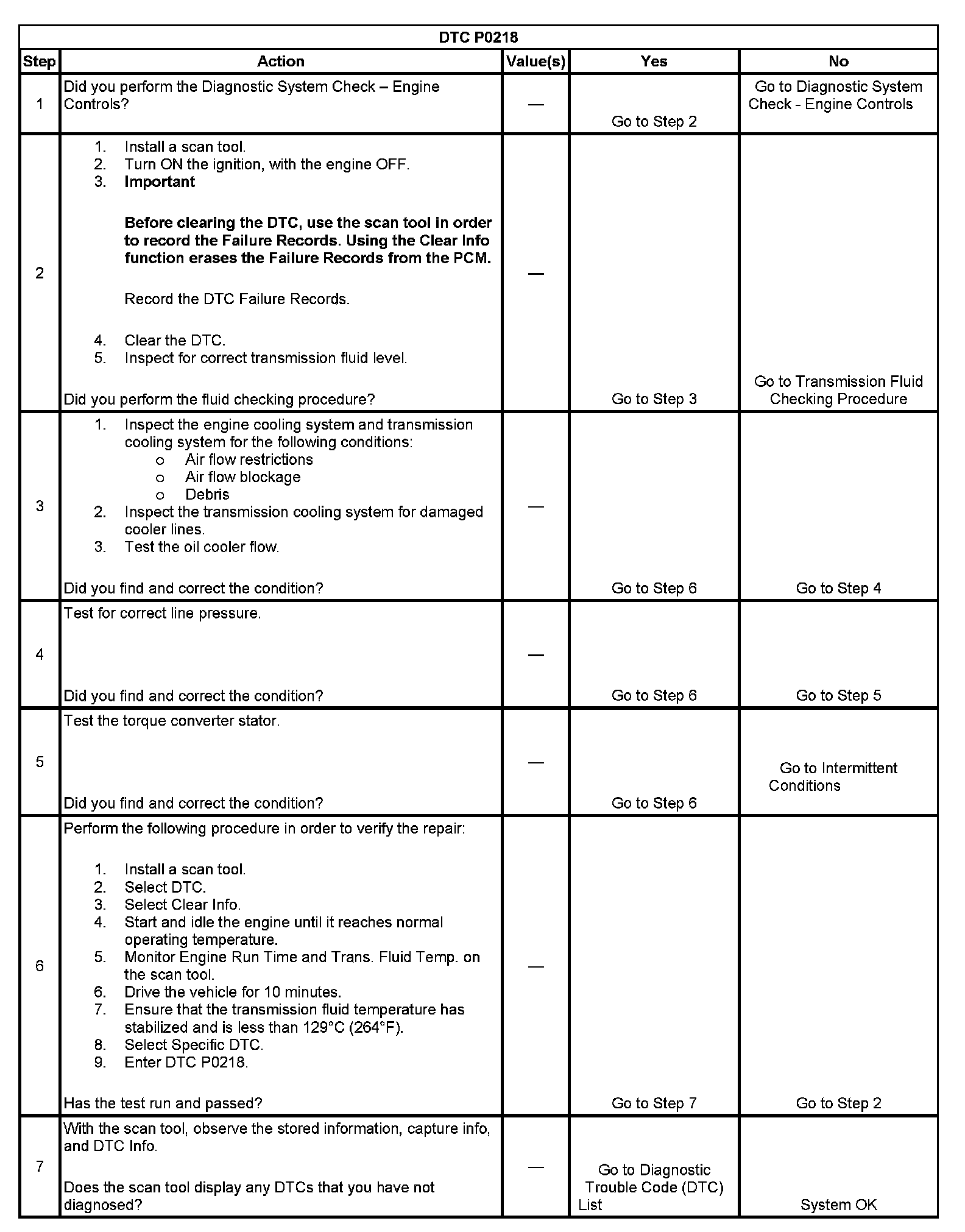 When the powertrain control module (PCM) detects a high transmission fluid temperature (TFT) for a long period of time, then DTC P0218 sets. DTC P0218 is a type C DTC.