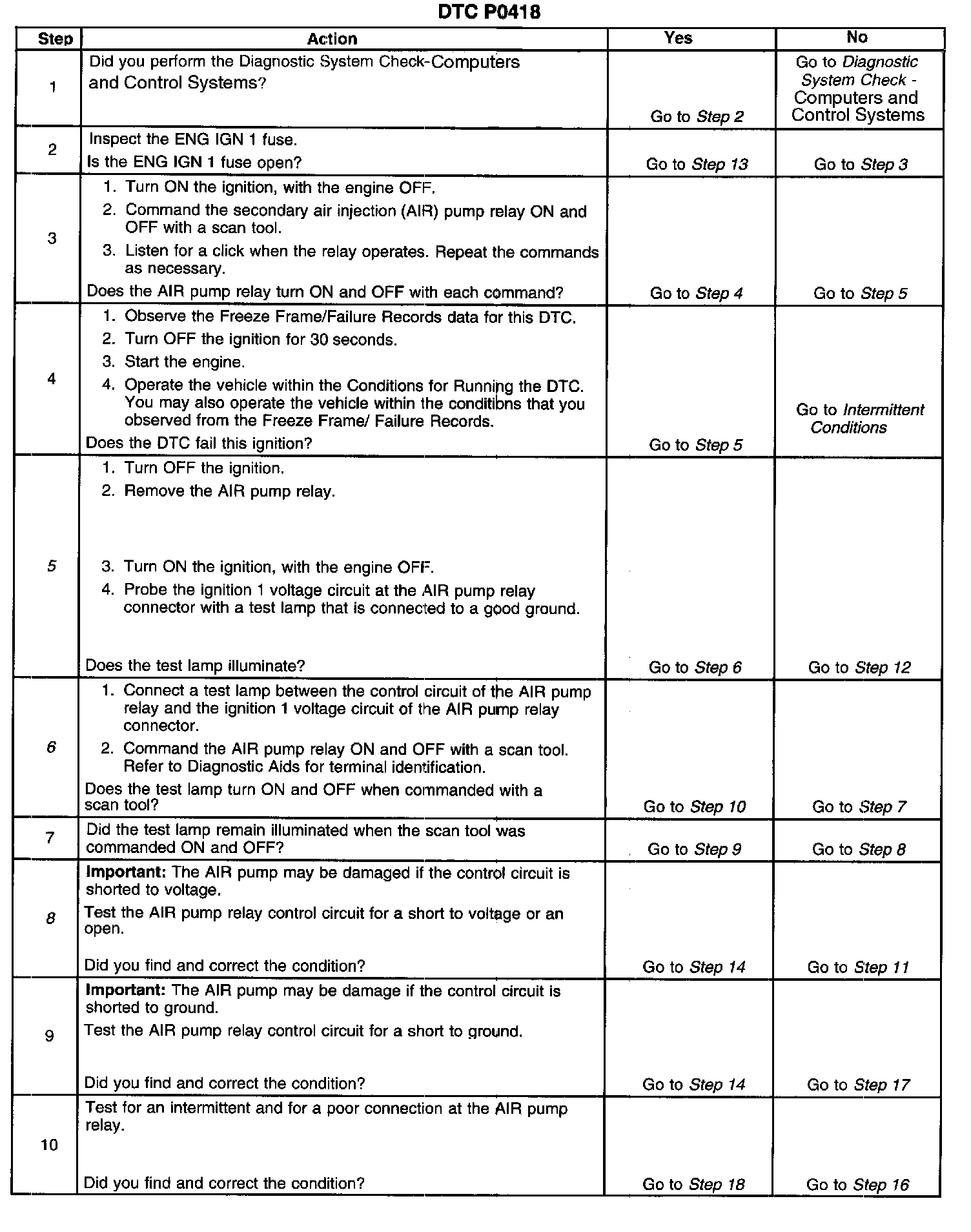 The secondary air injection (AIR) pump relay controls the high current flow to the AIR pump. Ignition voltage is supplied to the AIR pump relay coil when the ignition is ON. Battery positive voltage is supplied to the armature contacts at all times. The powertrain control module (PCM) controls the relay by supplying a ground path to the relay coil control circuit by an internal integrated circuit called an output driver module (ODM). The low side driver also incorporates a fault detection circuit that is continuously monitored by the PCM. The voltage on the control circuit should be battery voltage when the ignition is ON and the AIR pump relay is at rest. If the fault detection circuit measures a low voltage under this condition it is an indication of an open or short to ground on the control or ignition 1 circuits. An open AIR pump relay coil fault may also be present. If the PCM detects low voltage on the AIR pump relay control circuit when the AIR pump relay is commanded OFF or a high voltage when the AIR pump relay is commanded ON, DTC P0418 sets.