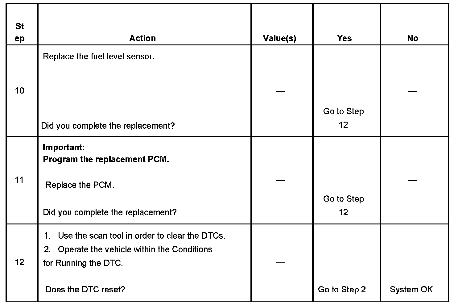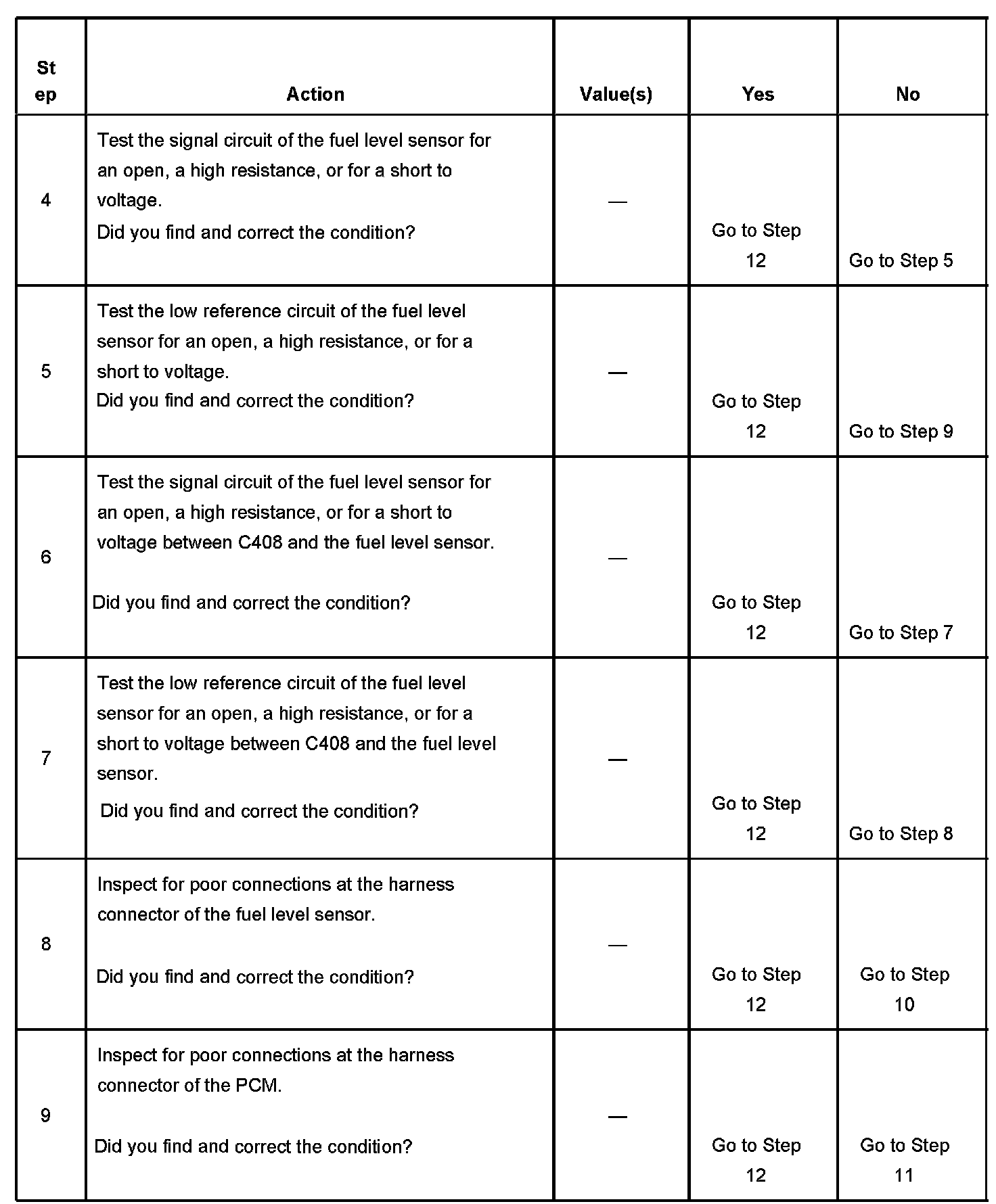 IMPORTANT: When inspecting for a deformed or warped fuel tank, measure the resistance of the suspect fuel level sensor at empty, with the sensor in the fuel tank,and again with the sensor removed from the fuel tank. The measured resistance values should be the same at empty.If the measured resistance values are not the same, refer to Fuel Tank Replacement (Right)Fuel Tank Replacement (Left)Fuel Tank Replacement (Right W/FFS)Fuel Tank Replacement (Left W/FFS) in Computers and Control Systems.