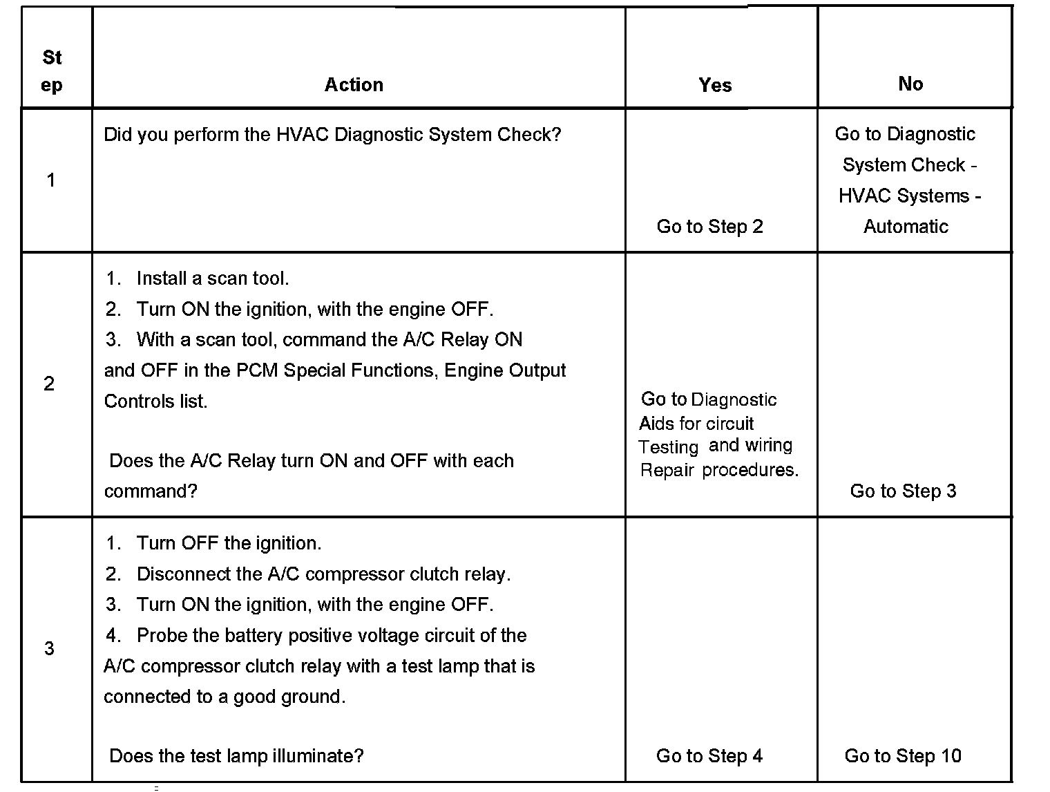 2. Listen for an audible click when the A/C compressor clutch relay operates. Command both the ON and OFF states. Repeat the commands as necessary.