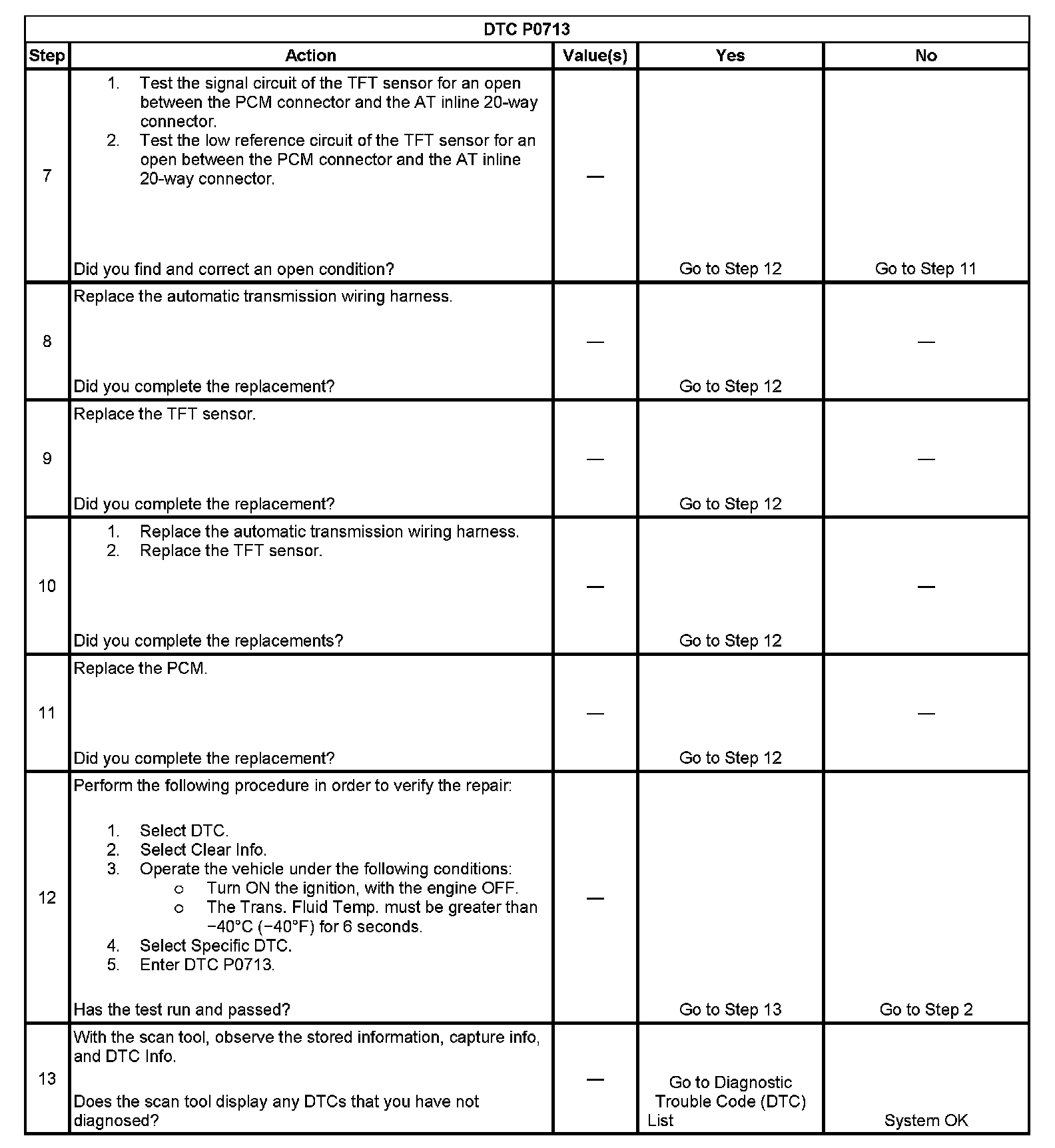 When the PCM detects a continuous open or short to power in the TFT signal circuit or the TFT sensor, then DTC P0713 sets. DTC P0713 is a type C DTC.