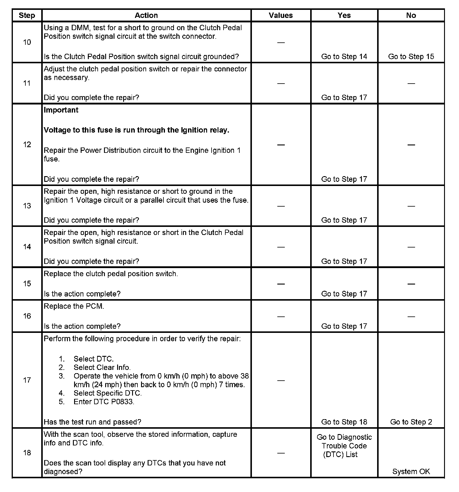 10. This step tests the Clutch Pedal Position switch signal circuit for a ground.
