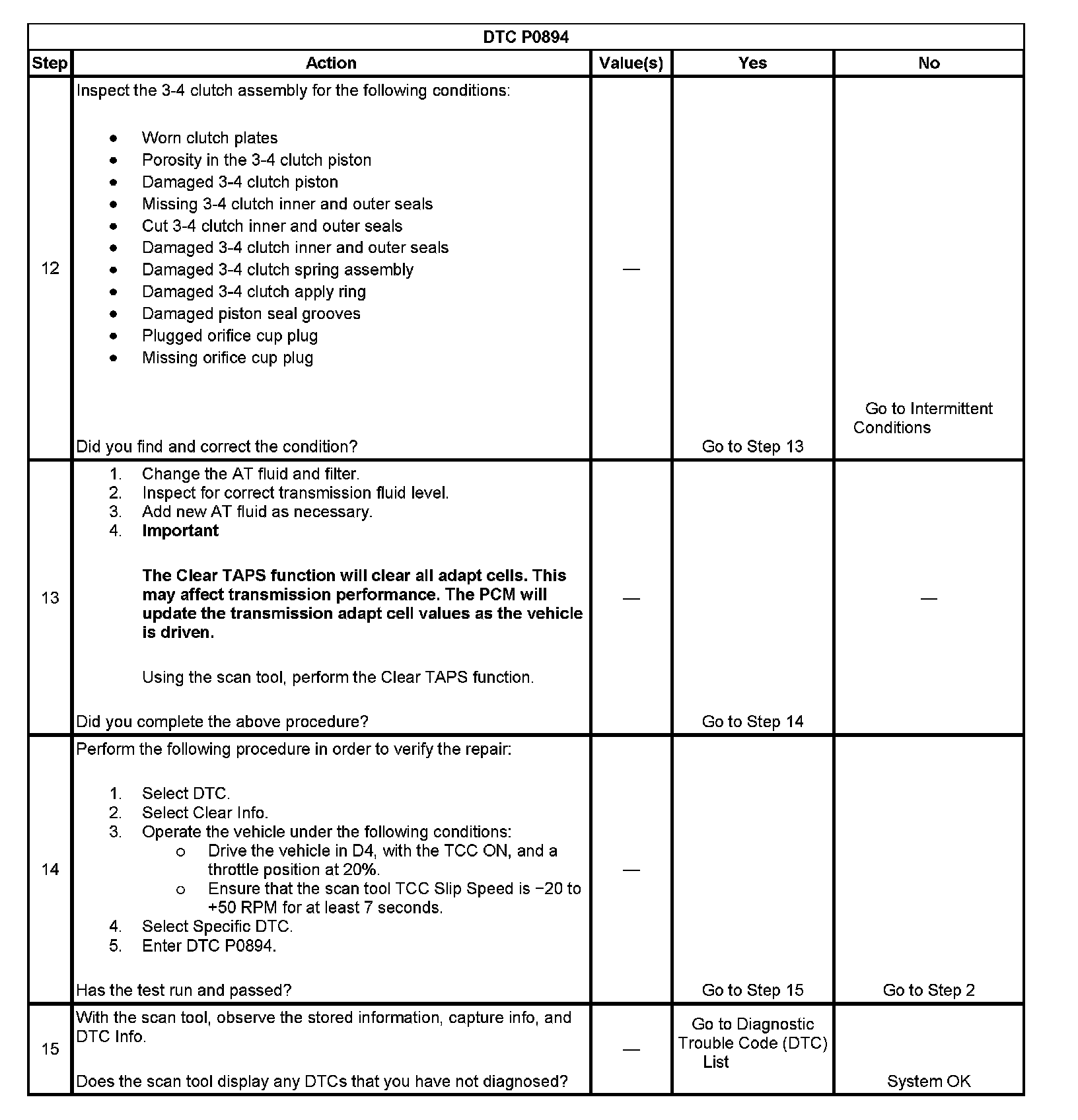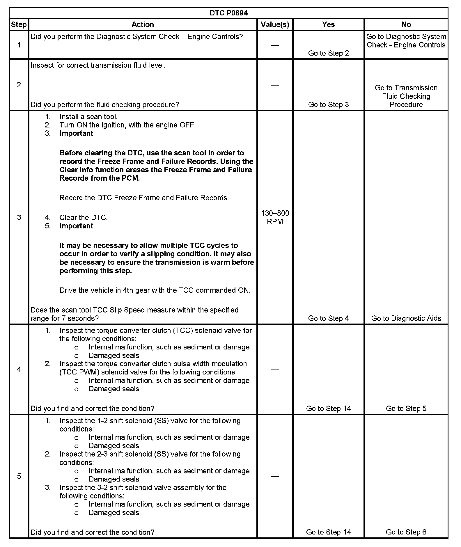 When the PCM detects excessive TCC slip when the TCC should be engaged, then DTC P0894 sets. DTC P0894 is a type B DTC.