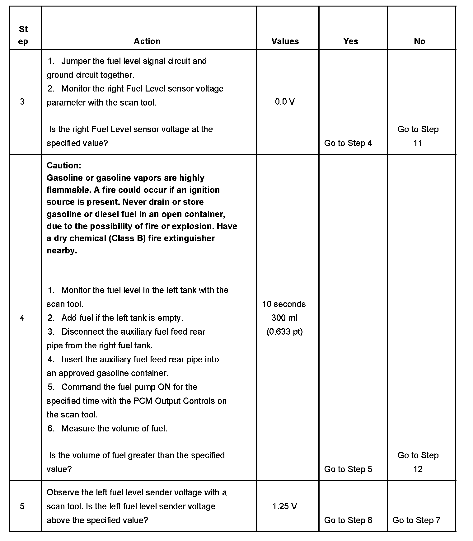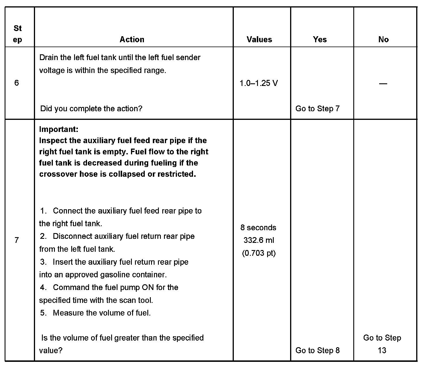 7. This step determines if fuel is being transferred to the left fuel tank.The fuel pump runs for 2 seconds each time it is commanded ON with the scan tool.The fuel pump must be enabled several times to achieve the time specified in the diagnostic table.