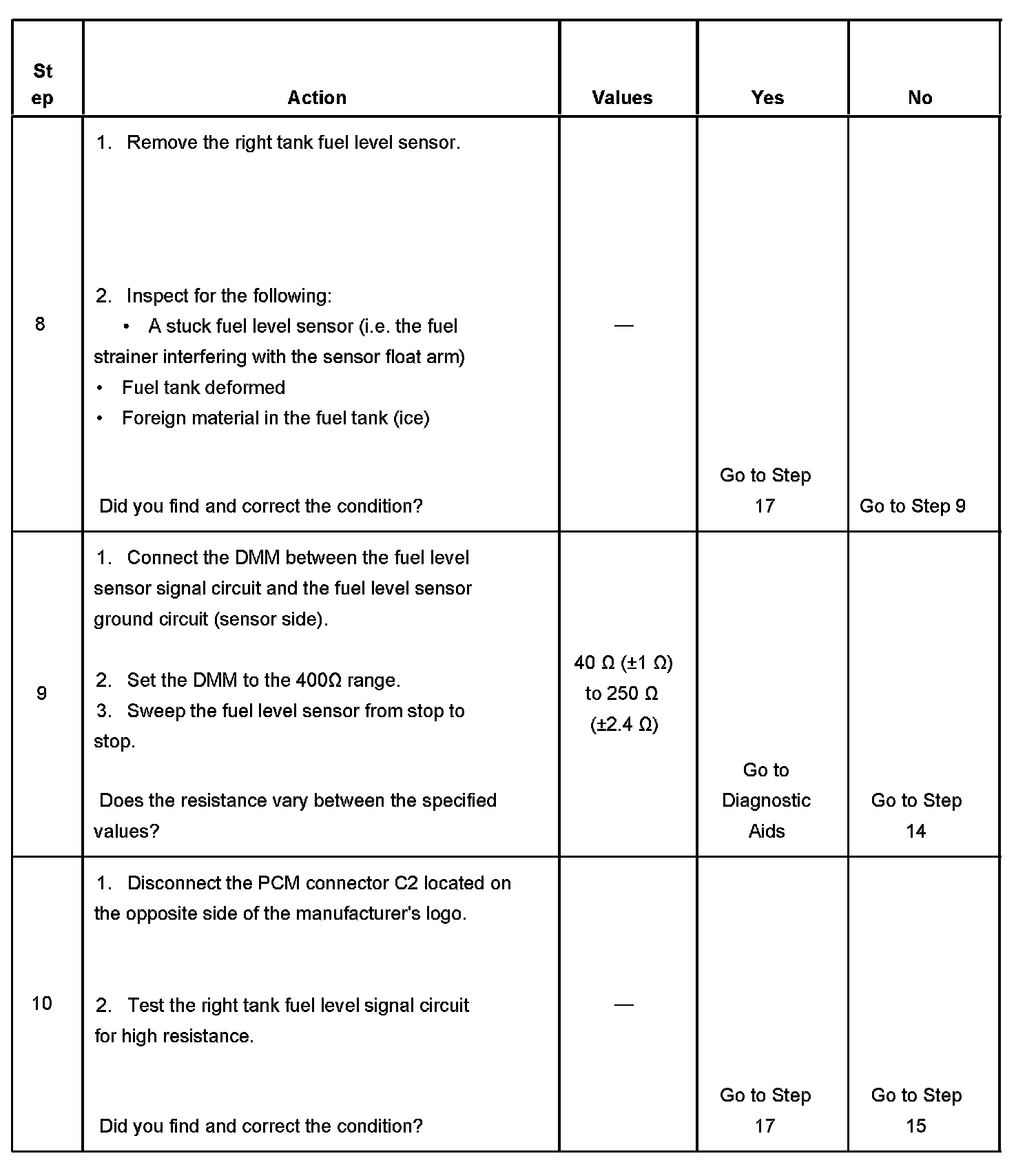 Depending on the current fuel level, it may be difficult to locate a malfunctioning sending unit. The malfunction may only occur when the fuel level is full or near empty. The fuel sending unit may need to be removed for further diagnosis. A fuel level sensor that has an intermittent condition causes this DTC to set.Remove the fuel level sensor. Refer to Fuel Sender Assembly Replacement (W/O FFS)Fuel Sender Assembly Replacement (RH W/FFS)Fuel Sender Assembly Replacement (LH W/FFS) in Computers and Control Systems in order to test the resistance of the sensor. The resistance of the sensor should change from 40 to 250 ohms.Replace the sensor if the resistance did not change or was out of range.