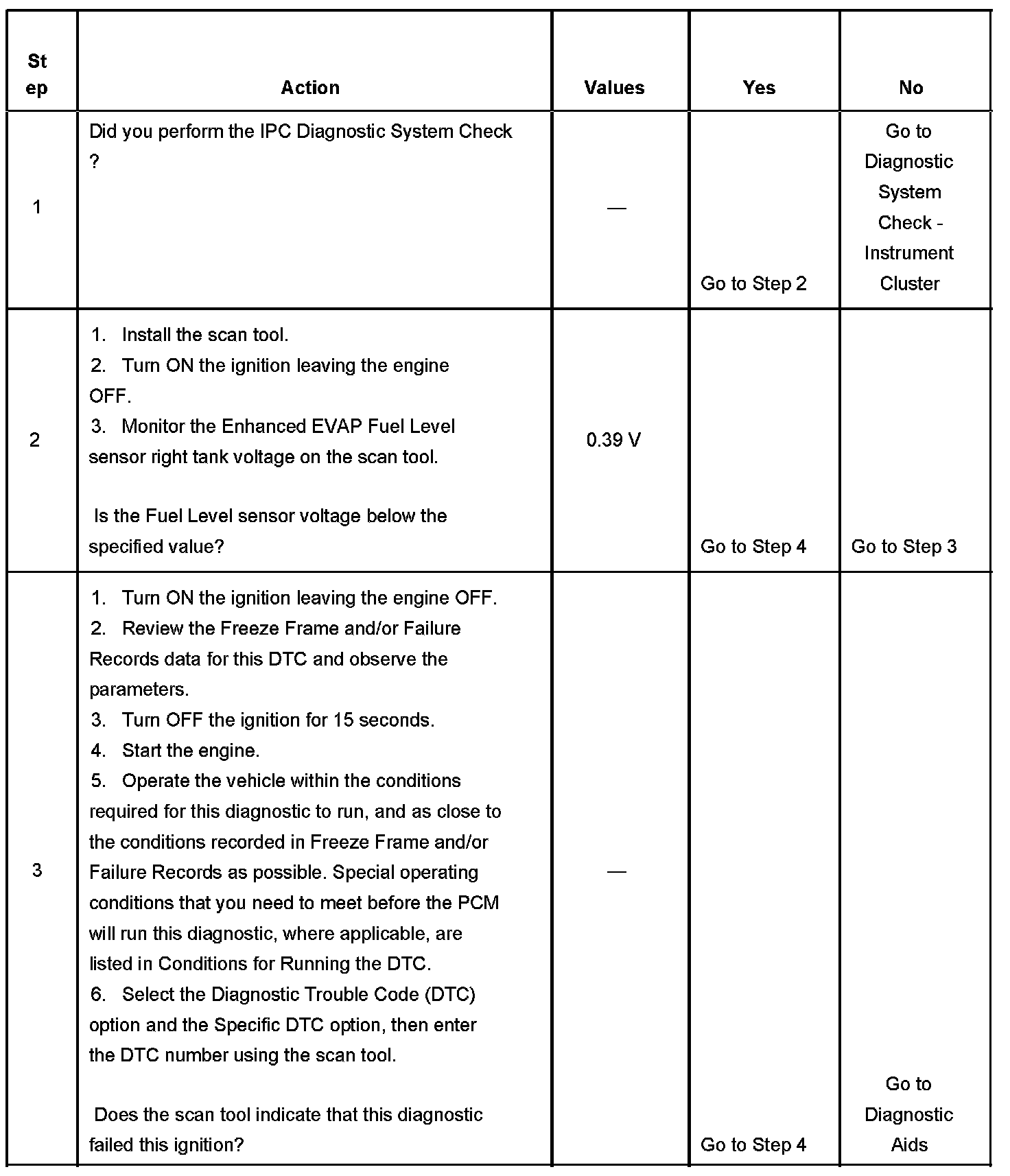 - Depending on the current fuel level, it may be difficult to locate a malfunctioning sending unit.The malfunction may only occur when the fuel level is full or near empty. The fuel sending unit may need to be removed for further diagnosis. A fuel level sensor that has an intermittent condition causes this DTC to set. Remove the fuel level sensor. Refer to Fuel Sender Assembly Replacement (W/O FFS)Fuel Sender Assembly Replacement (RH W/FFS)Fuel Sender Assembly Replacement (LH W/FFS) in Computers and Control Systems in order to test the resistance of the sensor. The resistance of the sensor should change from 40 to 250 ohms.Replace the sensor if the resistance did not change or was out of range.
