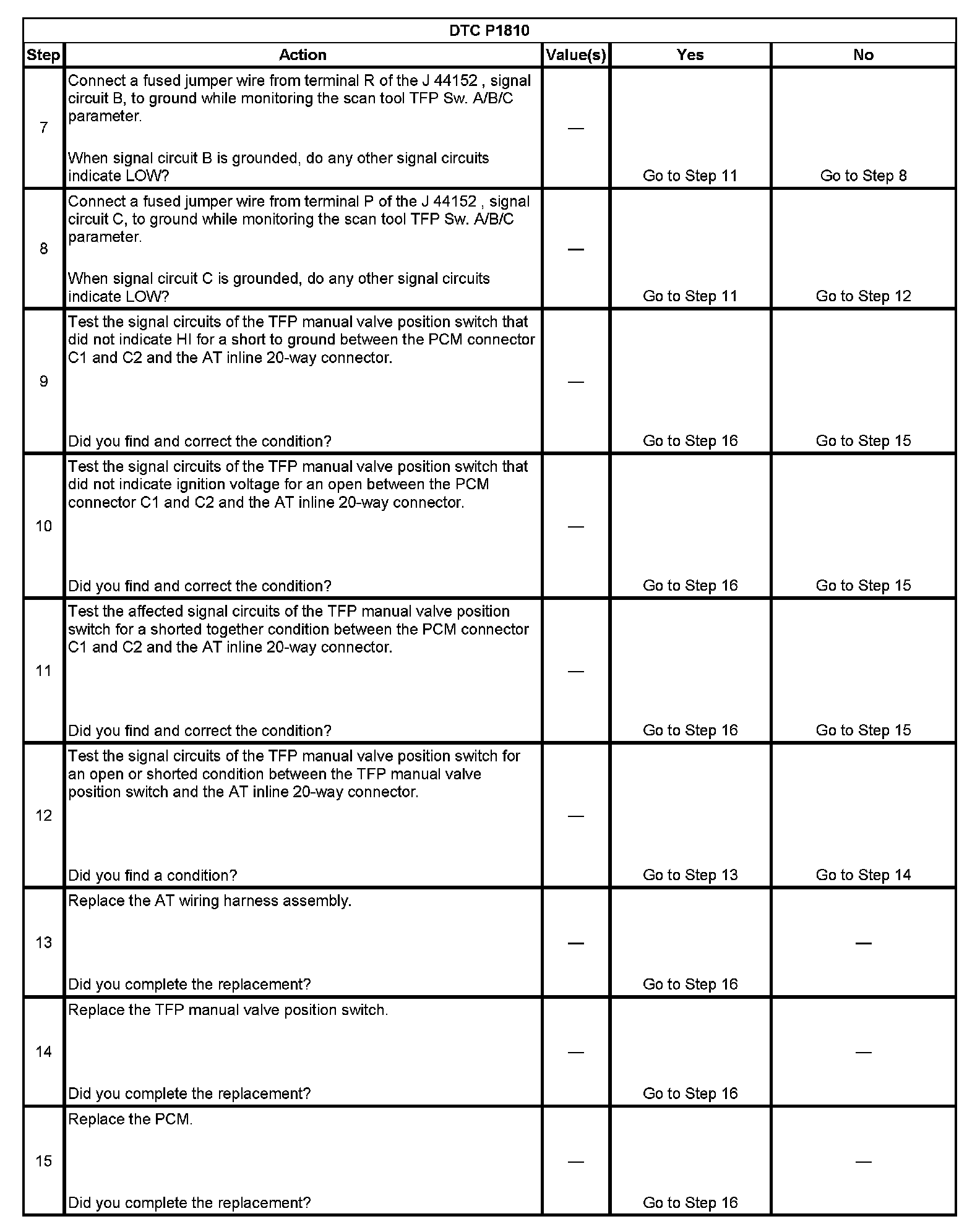 When the PCM detects an invalid state of the TFP manual valve position switch circuit by deciphering the TFP manual valve position switch inputs, then DTC P1810 sets. DTC P1810 is a type B DTC.
