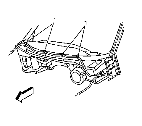 1. Route the cables through the opening in the dash panel, past the retainers (1) on the plenum panel, to the latches.
