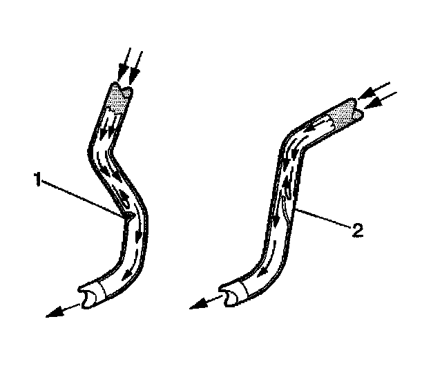 6. Squeeze the flexible brake hoses with firm finger pressure to check for soft spots (2), indicating an internal restriction. Check the entire length of each flexible brake hose.