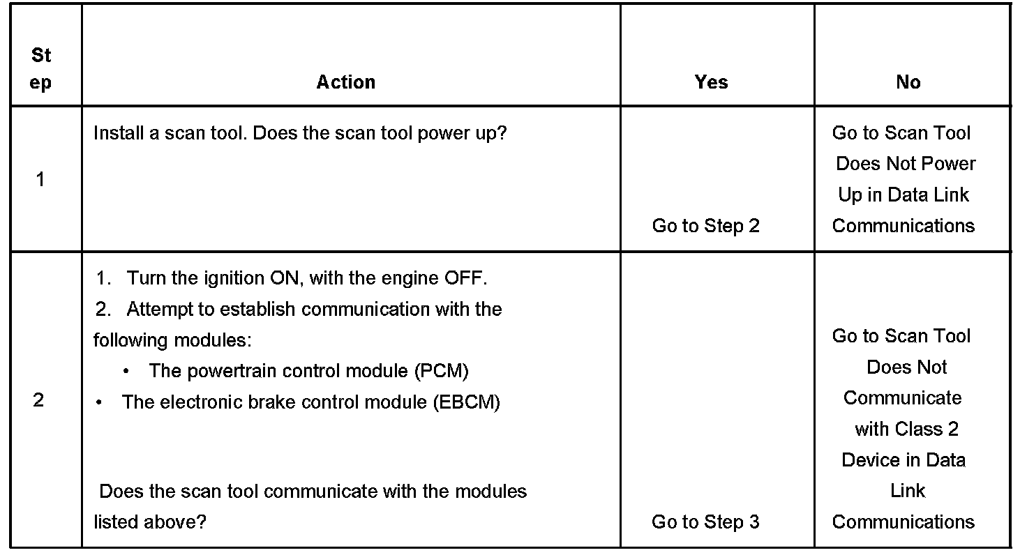 2. Lack of communication may be due to a malfunction in the class 2 serial data circuit. The specified procedure will determine the particular condition.