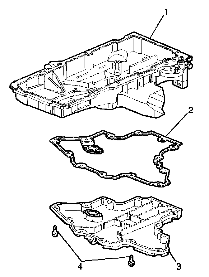 6. Separate the oil pan (1) - upper, gasket (2), oil pan (3) - lower, and bolts (4), if required.