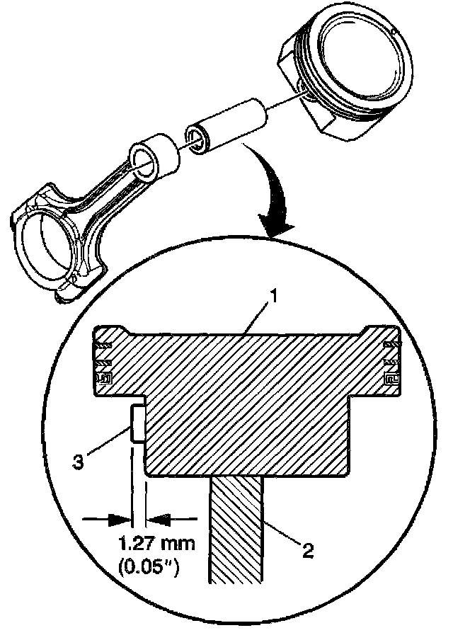 A properly installed piston pin should protrude 1.27 mm (0.05 inch) from the side of the piston.
