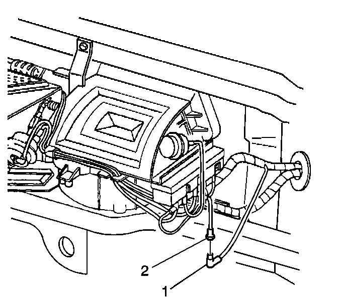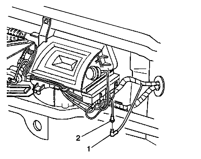 35. Disconnect the IP harness vacuum supply line (1) from the HVAC module vacuum harness (2).