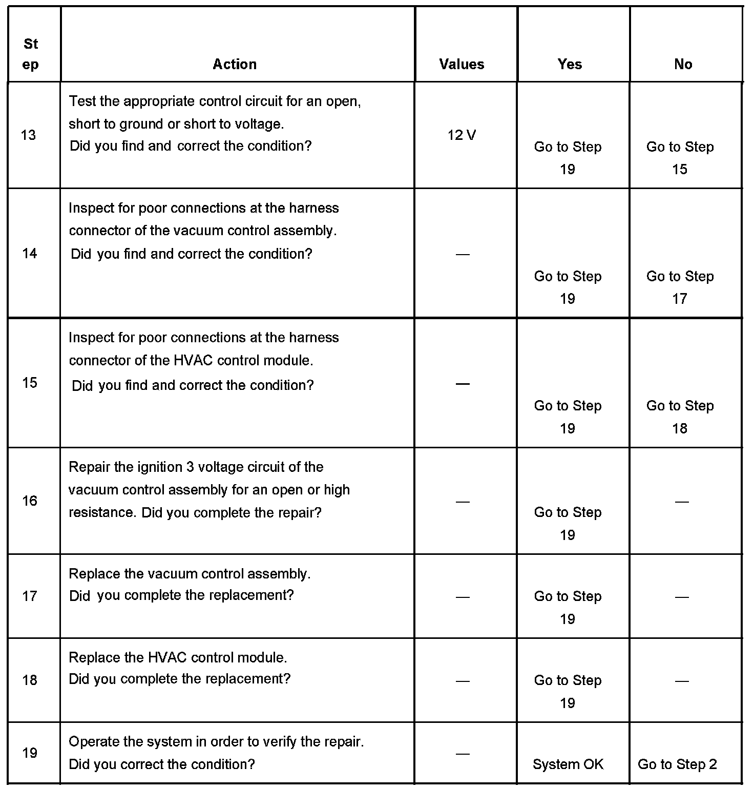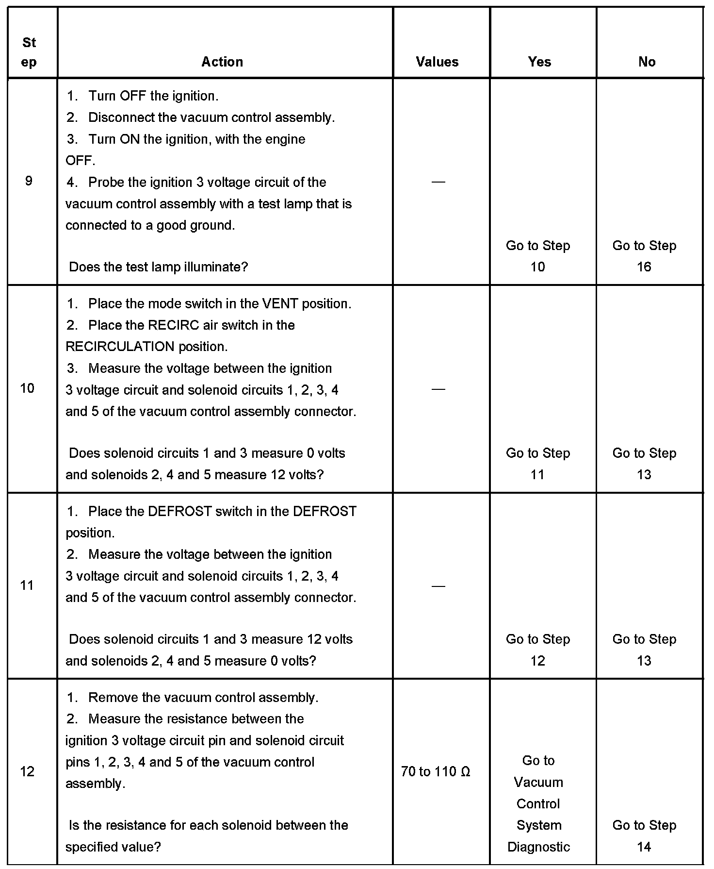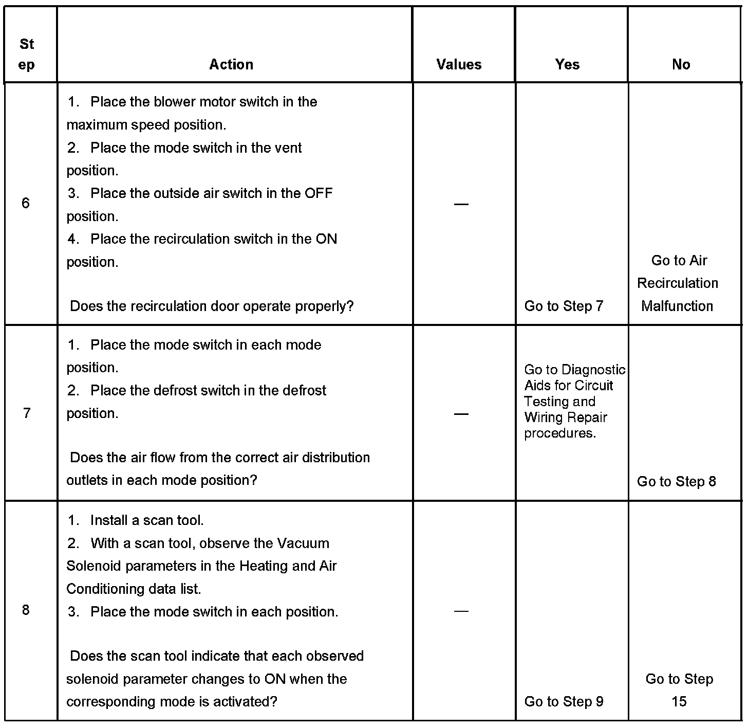 8. Tests the HVAC control module for the proper commanded state. The ON/OFF positions for each mode are as follows:FLOOR POSITION - solenoids 1 and 5 OFF, solenoids 2 and 3 ON, solenoid 4 ON or OFF.VENT POSITION - solenoids 1 and 3 OFF, solenoids 2 and 5 ON, solenoid 4 ON or OFF. VENT/FLOOR POSITION - solenoids 1, 3 and 5 OFF, solenoid 2 ON, solenoid 4 ON or OFF.FLOOR/DEFROST POSITION - solenoids 1, 2, 4 and 5 OFF and solenoid 3 ON.DEFROST POSITION - solenoids 1 and 3 ON and solenoids 2, 4 and 5 OFF.