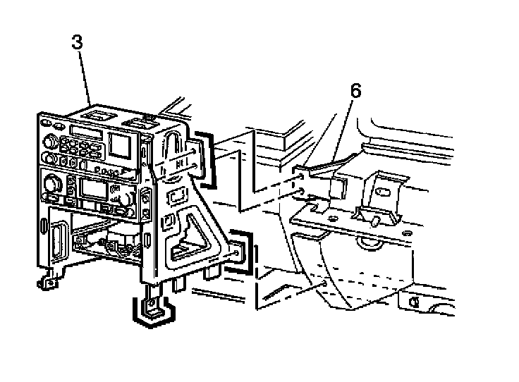 Mark the bracket (3), RH side, in relation to the I/P lower support beam, the driveline tunnel, and the passenger knee bolster bracket (6).