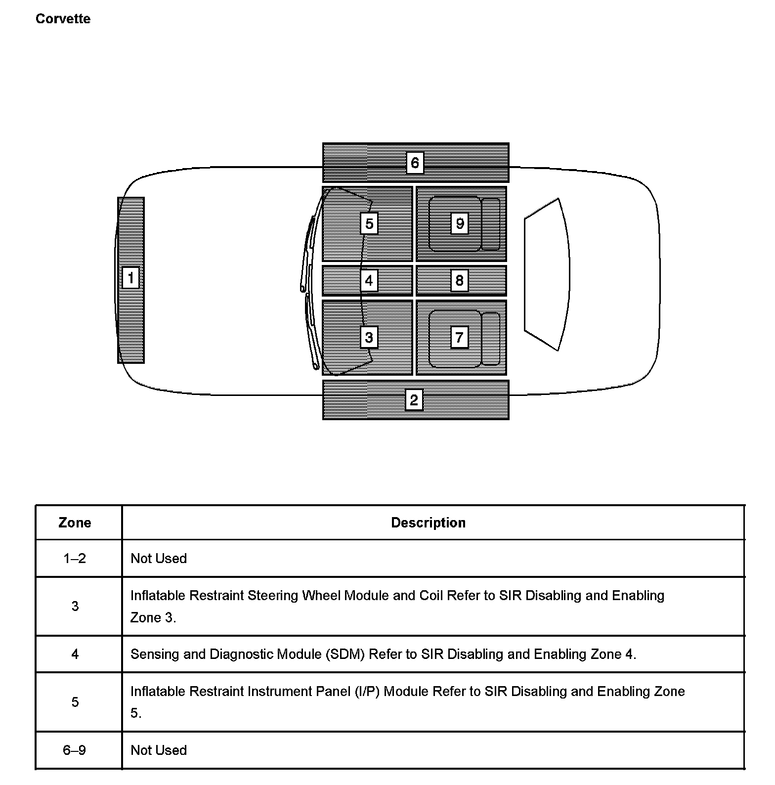 IMPORTANT: Refer to SIR Service Precautions before disabling the SIR system.The SIR system has been divided into Disabling and Enabling Zones. When performing service on or near SIR components or SIR wiring, it may be necessary to disable the SIR components in that zone. It may be necessary to disable more than one zone depending on the location of other SIR components and the area being serviced, refer to SIR Zone Identification Views. Refer to the illustration below, to identify the specific zone or zones in which service will be performed. After identifying the zone or zones, proceed to the disabling and enabling procedures for that particular zone or zones.