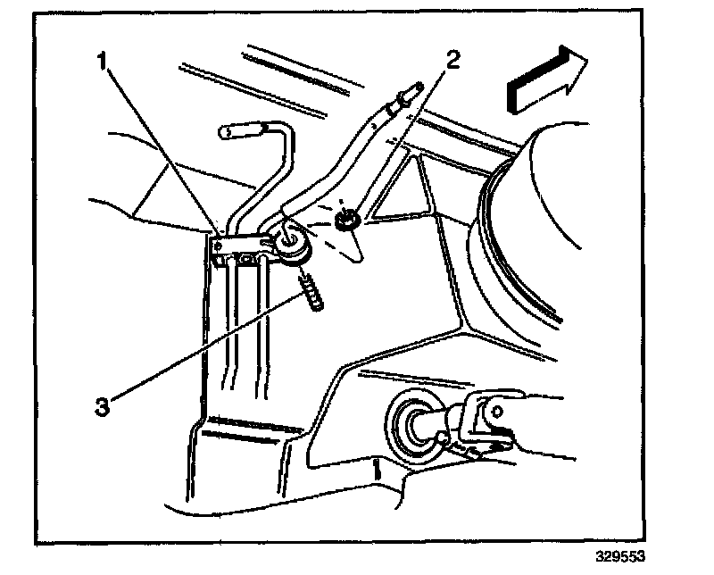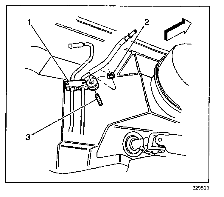 4. Disconnect the fuel hose (2) from the chassis fuel feed pipe (3).