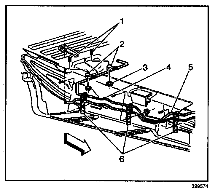 1. Install the chassis fuel pipe (5) into the underbody retainers (6).