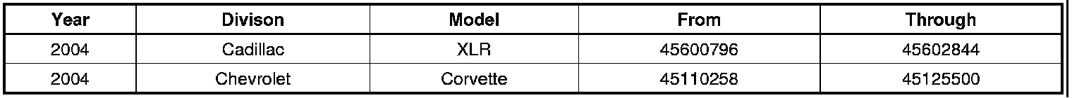 Involved are certain 2004 model year Cadillac XLR and Chevrolet Corvette vehicles built within the following VIN breakpoints: