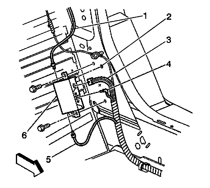 5. Remove the screws retaining the antenna module (6) to the lock pillar.