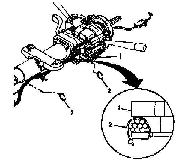 3. Install the wire harness assembly (1) into the wire harness strap (2).