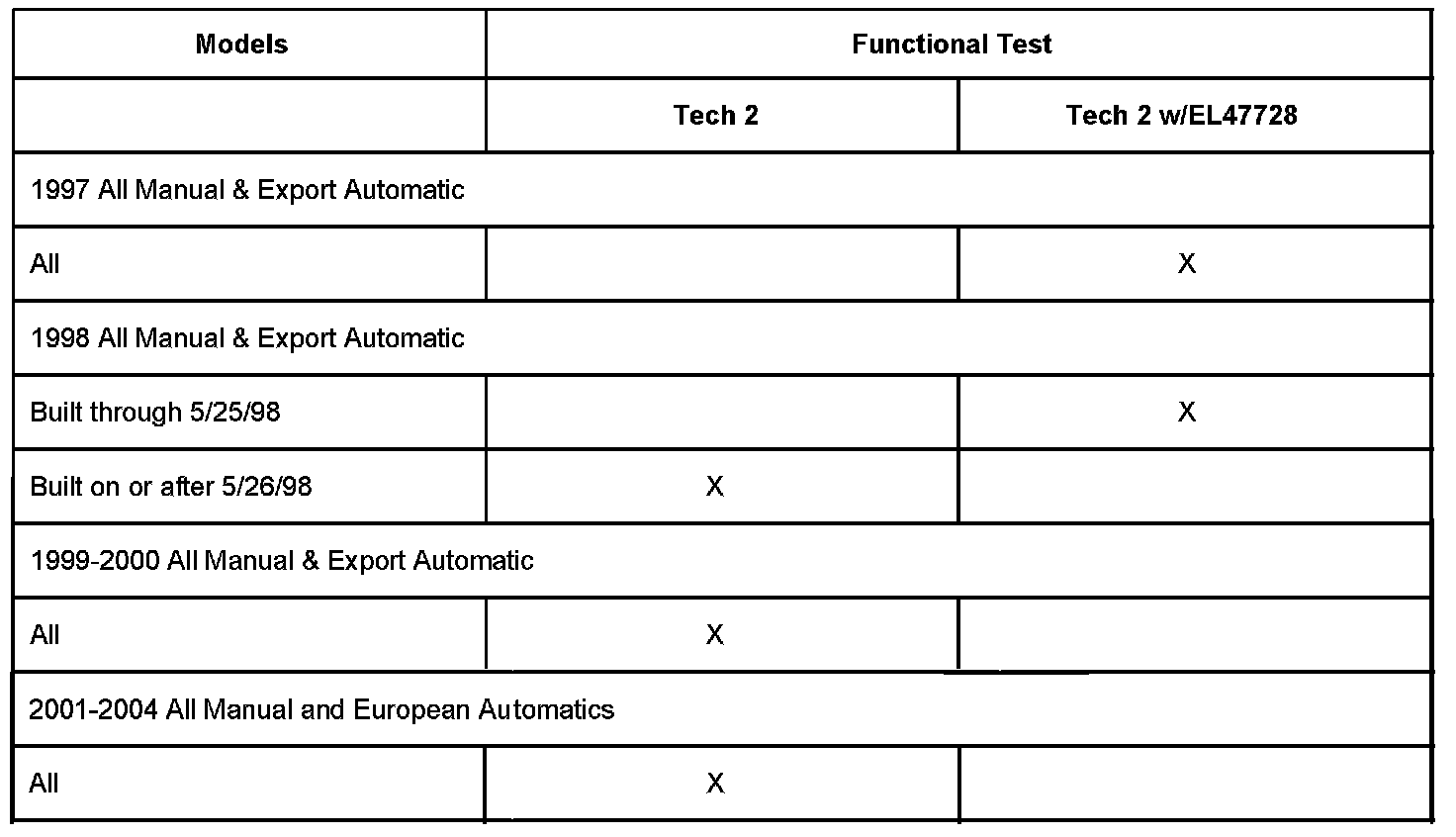 The required functional test may require a special tool that was shipped to all Corvette Dealers. Depending on the model year of the vehicle, Special Tool EL47728 will be needed to complete the repair. Refer to the chart to determine the correct functional test for the vehicle you are working on.