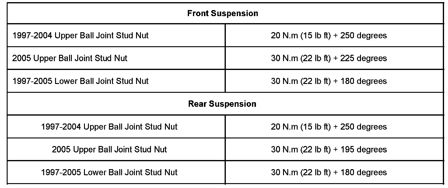 This bulletin is being issued to revise the upper and lower ball joint stud nut tightening specifications in the Front Suspension sub-section and the Rear Suspension sub-section of the Service Manual. Please replace the current information in the Service Manual with the following information.