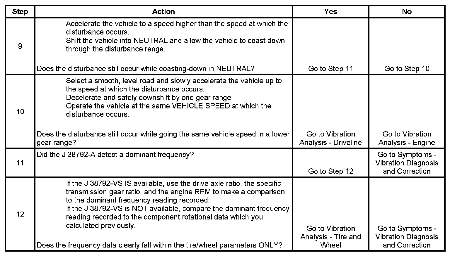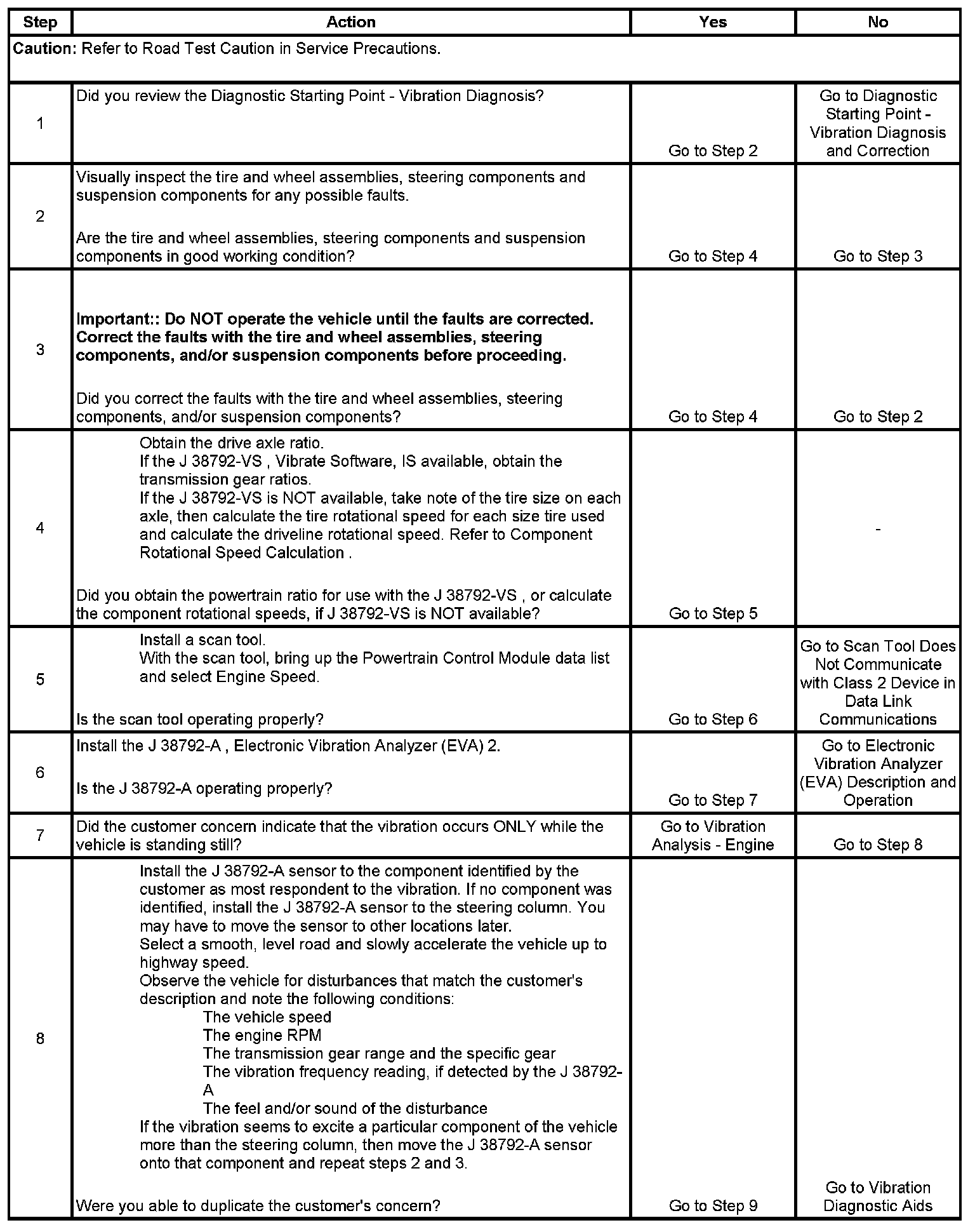 4. Obtaining rotational speed for the components rotating at both tire/wheel speed and driveline speed is critical to systematically eliminating specific vehicle component groups. These component rotational speeds can be generated by using the J 38792-VS, Vibrate Software, or through calculating them manually.