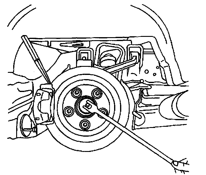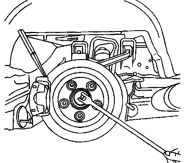 15. Insert a drift or punch into the brake rotor cooling fins and against the caliper to prevent the wheel hub and bearing from turning.