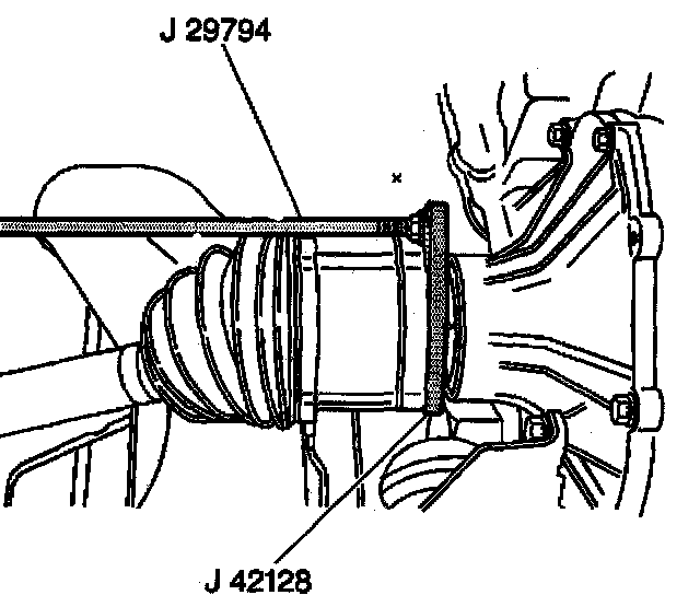 21. install the J42128 evenly onto the rear beveled surface of the drive shaft inner joint housing.