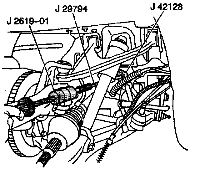 22. Disengage the drive shaft from the rear axle differential using the J42128, J29794, and J261901, then remove the tool assembly.