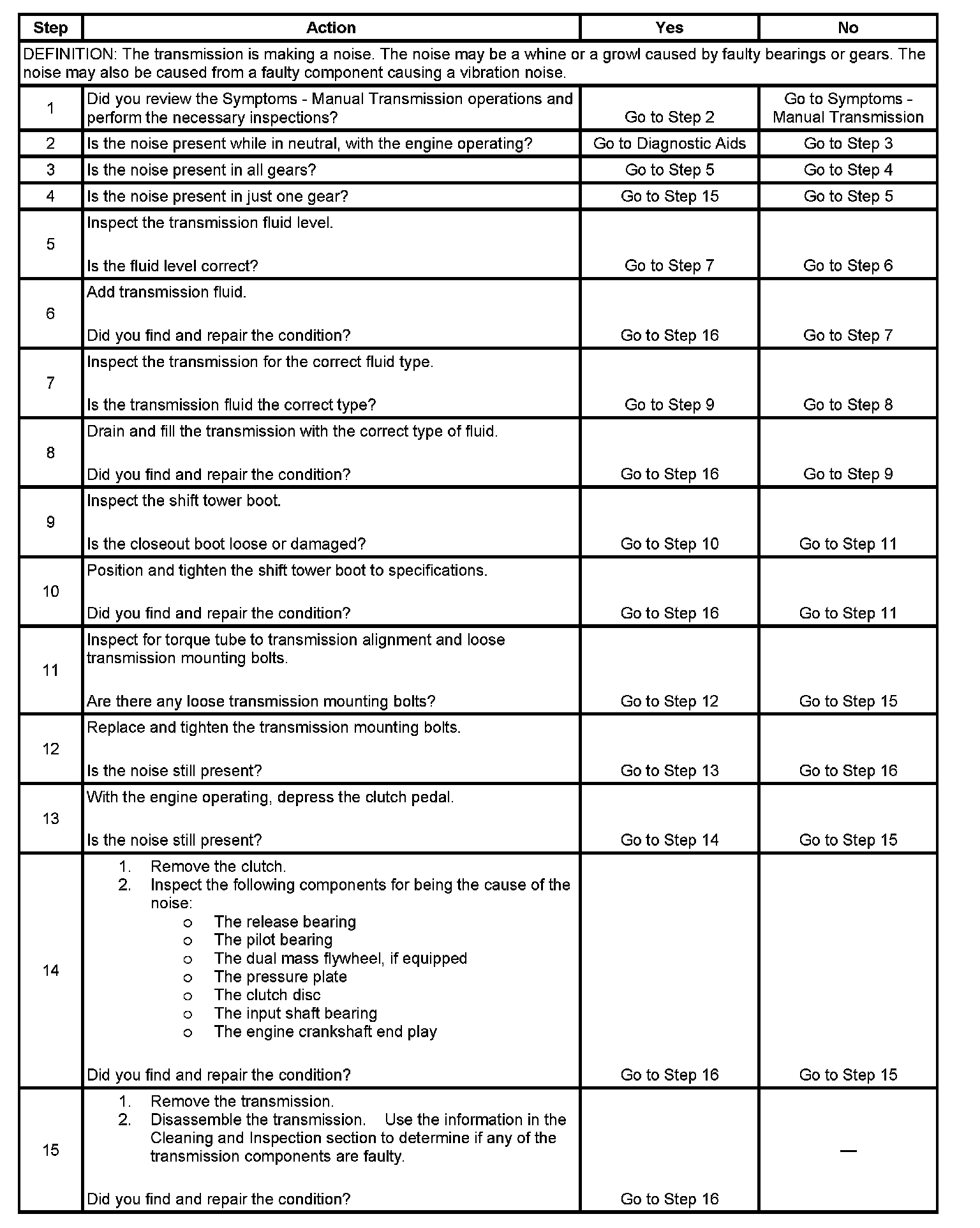 13. This step tests to determine if clutch components are making the noise. Depress the clutch pedal slowly and listen for the change in noise. If the noise changes while pressing the pedal, it may be a faulty clutch component. If the noise does not change until the clutch is completely disengaged, the transmission component is faulty.