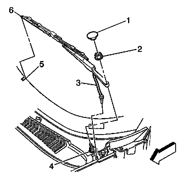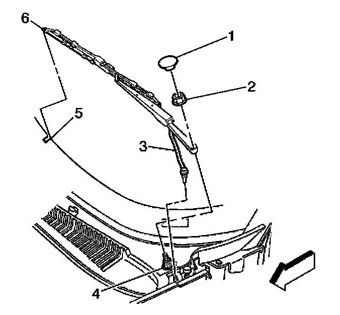 5. Place a piece of masking tape (5) onto the windshield at the tip of each wiper blade (6) to aid in the wiper arm reinstallation.