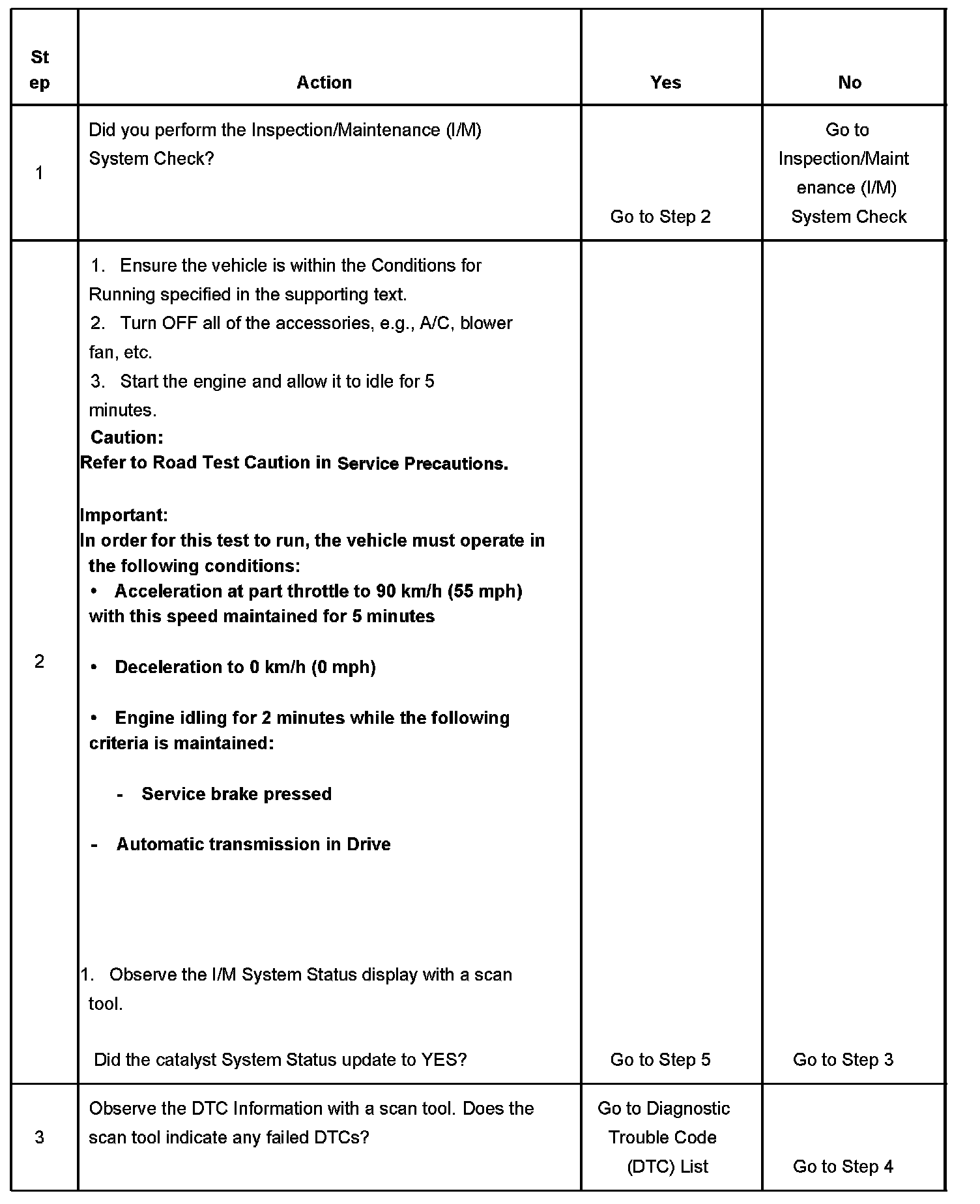 The purpose of this test is to satisfy the enable criteria necessary to execute inspection/maintenance (I/M) readiness diagnostics for the catalyst system.The test may be used to set the I/M System Status indicators to YES.The I/M System Status display on the scan tool provides an indication of whether the control module has completed the required tests. The I/M System Status does not indicate that the tests have passed or failed. When all of the diagnostics for a specific system have run and passed, the I/M System Status will update to YES. If a test for a specific system has failed, the I/M System Status will update to YES, indicating a determination was made even if all of the other tests for that system have not run.