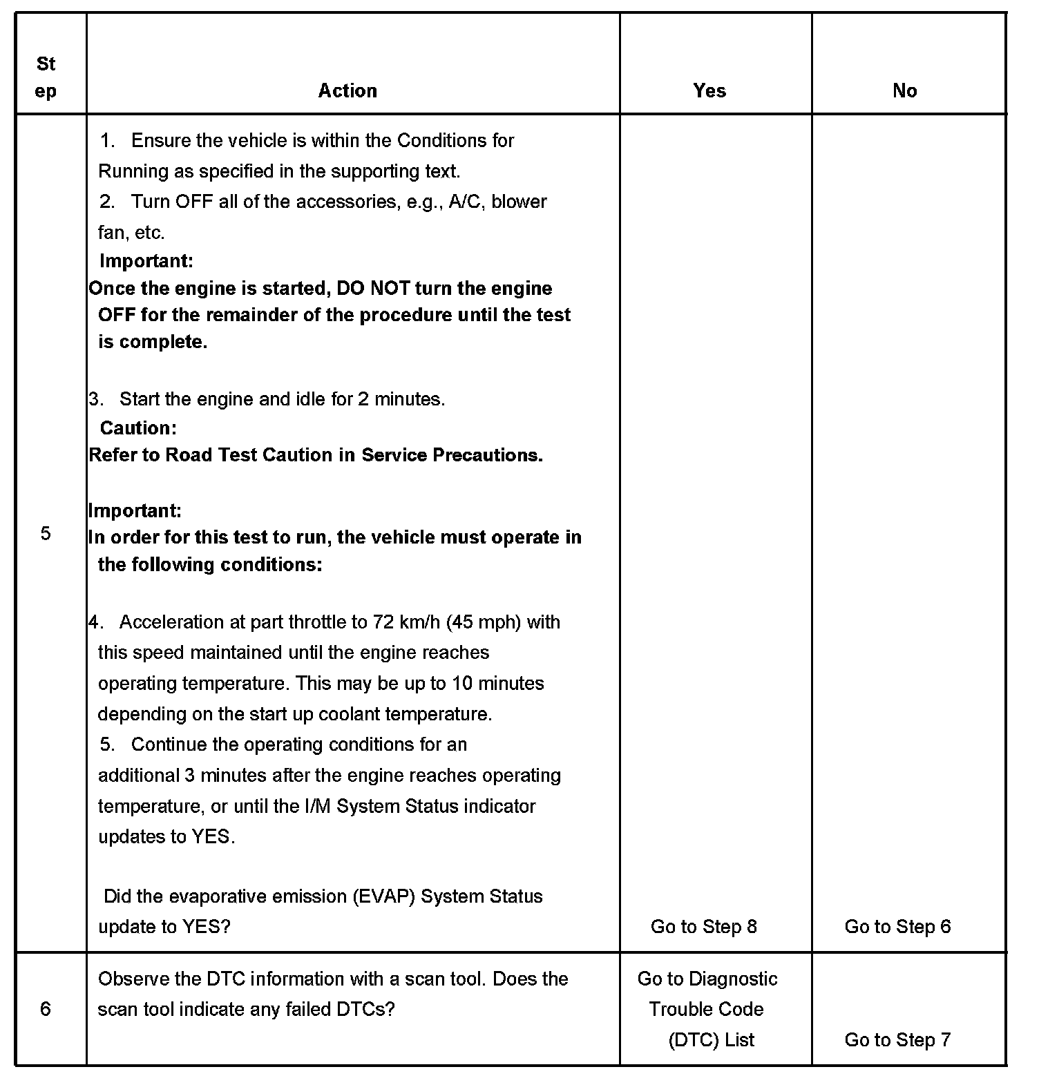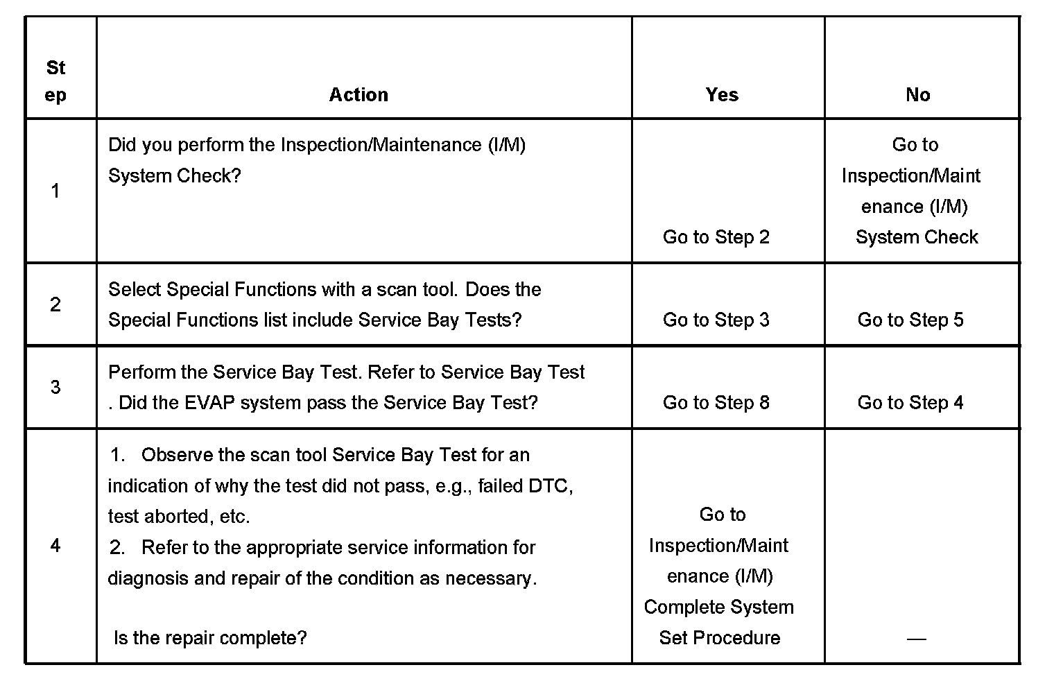 The purpose of this test is to satisfy the enable criteria necessary to execute inspection/maintenance (I/M) readiness diagnostics for the evaporative emission (EVAP) system. The test may be used to set the I/M System Status indicators to YES. The I/M System Status display on the scan tool indicates whether or not the control module has completed the required test. The required test is complete when either all of the DTCs comprising the test have run and passed, or when any one of the DTCs comprising the test has illuminated the malfunction indicator lamp (MIL). Once the test is complete, the I/M System Status display will indicate YES in the completed column. Performing a visual inspection prior to running the EVAP test may prevent having to repeat the test due to the fact that a failed or aborted test will require the vehicle to cool down in order to meet the enable criteria to run another test.