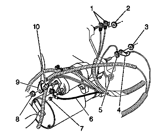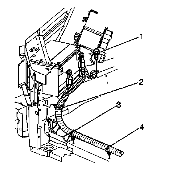 12. Unclip and remove the battery cable harness from the retainers (2,3,4).