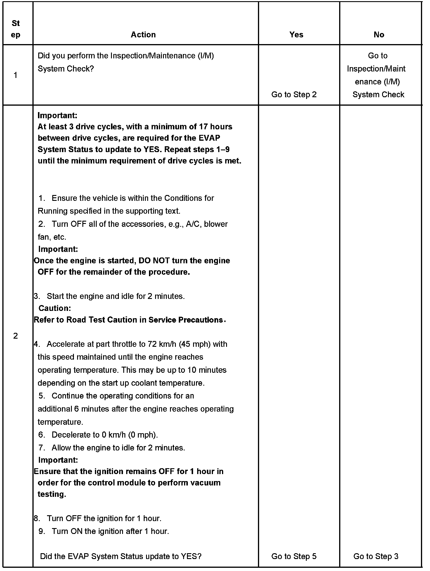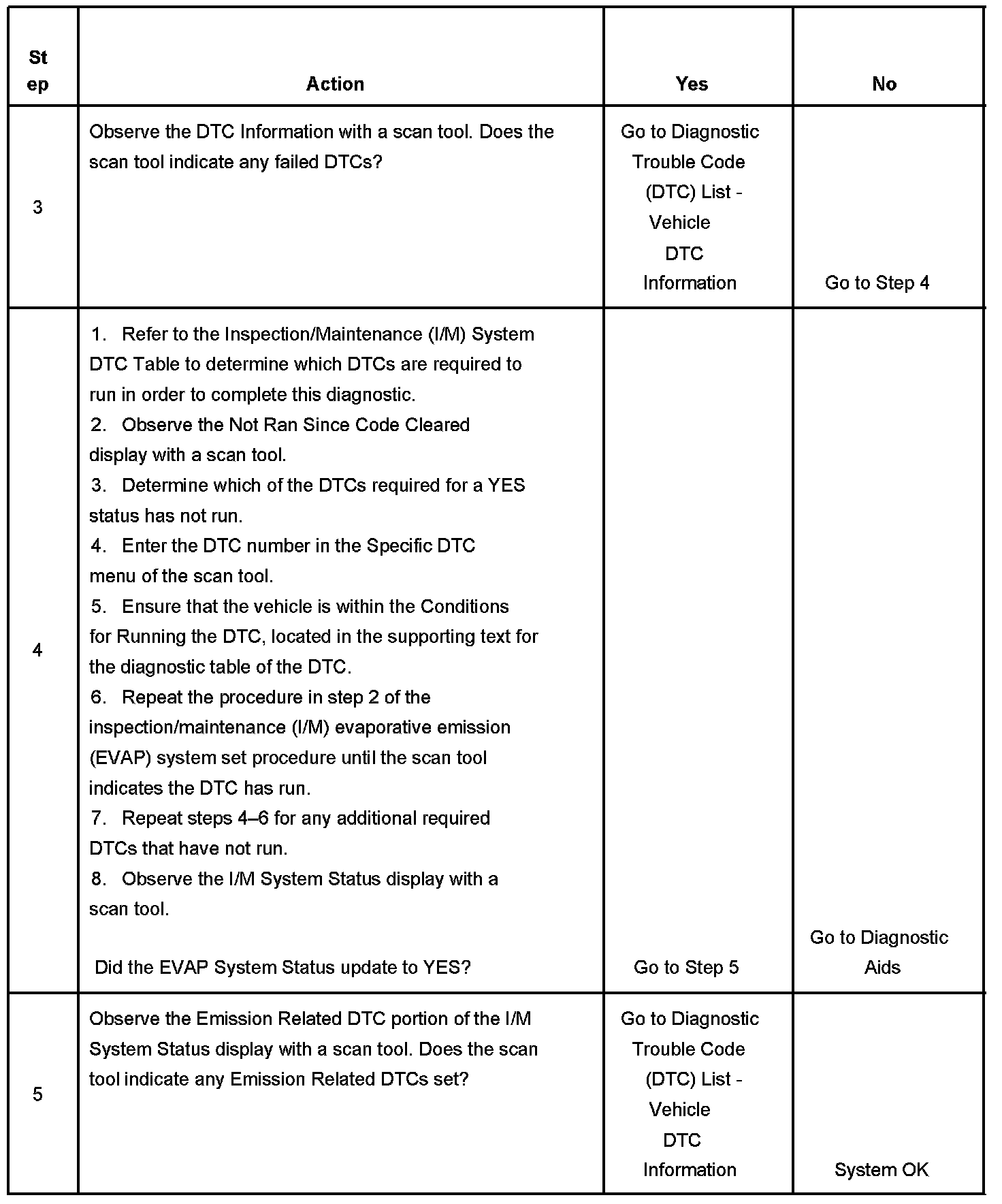 The purpose of this procedure is to satisfy the enable criteria necessary to execute inspection/maintenance (I/M) readiness diagnostics for the evaporative emission (EVAP) system. The procedure may be used to set the EVAP I/M System Status display on the scan tool to YES. The EVAP I/M System Status display indicates whether or not the control module has completed the readiness diagnostics. The readiness diagnostics complete when all DTCs comprising the diagnostics run and pass, or any DTC comprising the diagnostics illuminates the malfunction indicator lamp (MIL). If the diagnostics pass during one drive cycle, seventeen hours must elapse, regardless of whether the vehicle is driven or not. Then, the diagnostics will run again during the next drive cycle in which the conditions for running are met. Once the diagnostics have passed during the third drive cycle, the EVAP I/M System Status display will be updated to YES. A failed or aborted diagnostic will require the vehicle to cool down in order to meet the enable criteria for another drive cycle. Therefore, performing a visual inspection prior to running the EVAP test may prevent having to repeat the drive cycle.