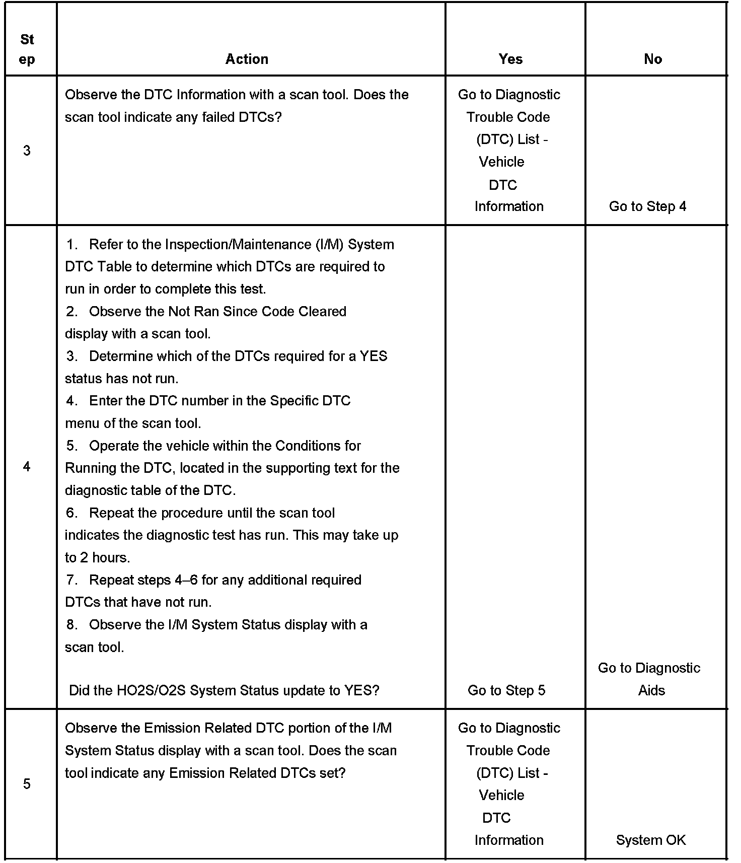 The purpose of this test is to satisfy the enable criteria necessary to execute I/M readiness diagnostics for the oxygen sensor/heated oxygen sensor (O2S/HO2S) system. The test may be used to set the I/M System Status to YES. The I/M System Status Display on the scan tool provides an indication of whether the control module has completed the required tests. The I/M System Status does not indicate that the tests have passed or failed. When all of the diagnostics for a specific system have run and passed the I/M System Status will update to YES. If a test for a specific system has failed, the I/M System Status will update to YES, indicating a determination was made, even if all of the other tests for that system have not run.